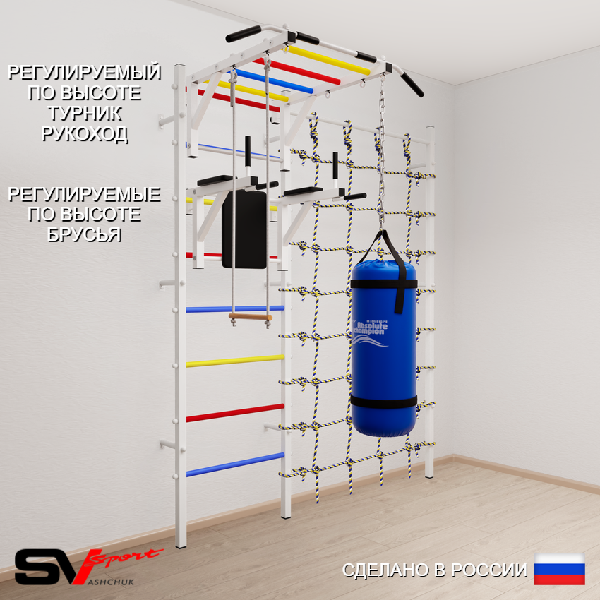 КОМПЛЕКТАЦИЯ: Шведская стенка Sv Sport усиленная (профиль вертикальных стоек 60 х 40 х 2 мм), Турник Sv Sport рукоход к ШС, Брусья Sv Sport к ШС, Трапеция, Цепь удлинитель 90см, Мешок боксерский 22кг, Канатный лаз.