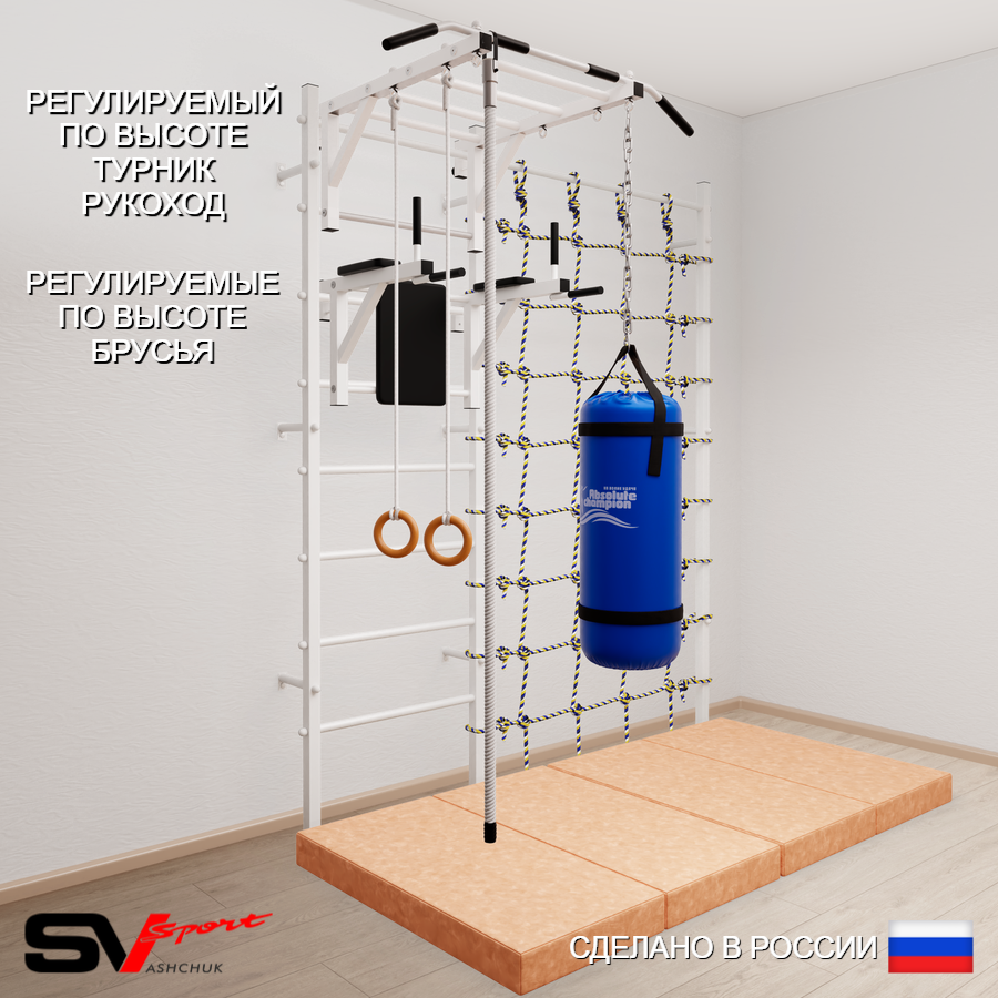 КОМПЛЕКТАЦИЯ: Шведская стенка Sv Sport усиленная (профиль вертикальных стоек 60 х 40 х 2 мм), Турник Sv Sport рукоход к ШС, Брусья Sv Sport к ШС, Kанат, Kольца деревянные, Цепь удлинитель 90см, Мешок боксерский 22кг, Спортивный мат 100 х 200 х 10 см складной, Канатный лаз.