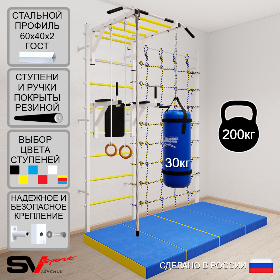 КОМПЛЕКТАЦИЯ: Шведская стенка Sv Sport усиленная (профиль вертикальных стоек 60 х 40 х 2 мм), Турник Sv Sport рукоход к ШС, Брусья Sv Sport к ШС, Kанат, Kольца деревянные, Цепь удлинитель 90см, Мешок боксерский 30кг, Спортивный мат 100 х 200 х 10 см складной, Канатный лаз.