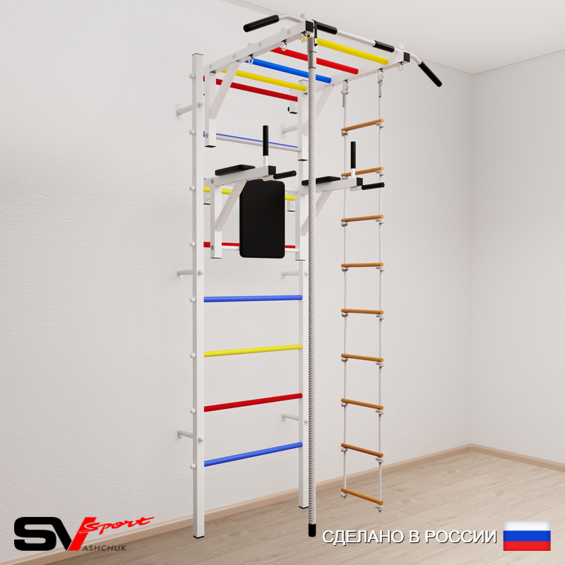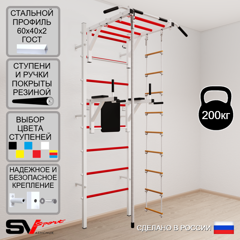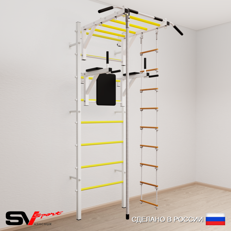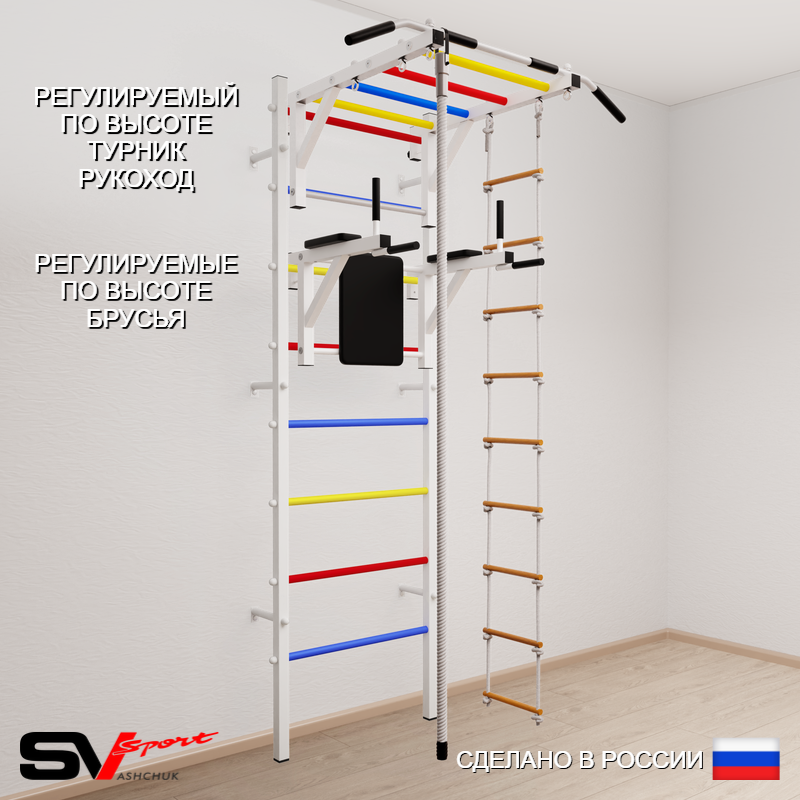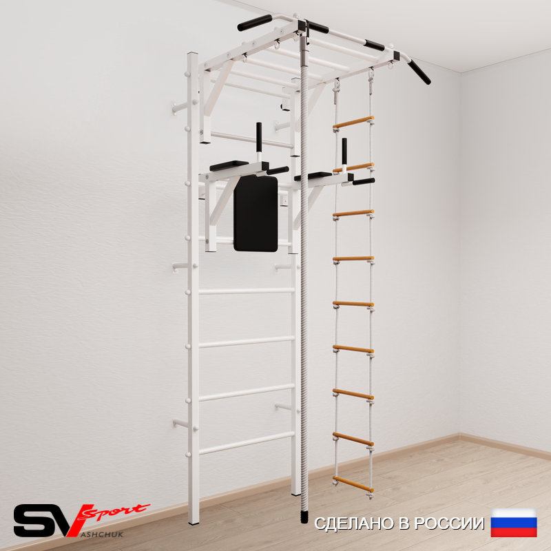 КОМПЛЕКТАЦИЯ: Шведская стенка Sv Sport усиленная (профиль вертикальных стоек 60 х 40 х 2 мм), Турник Sv Sport рукоход к ШС, Брусья Sv Sport к ШС, Kанат, Лестница веревочная.