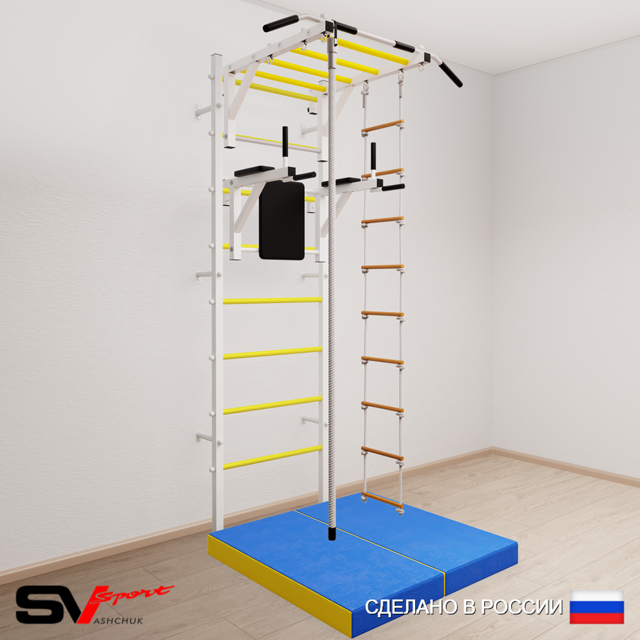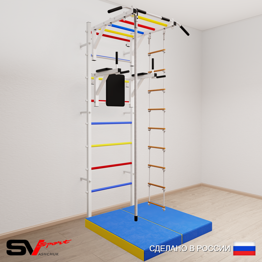 КОМПЛЕКТАЦИЯ: Шведская стенка Sv Sport усиленная (профиль вертикальных стоек 60 х 40 х 2 мм), Турник Sv Sport рукоход к ШС, Брусья Sv Sport к ШС, Kанат, Лестница веревочная, Спортивный мат 100 х 100 х 10 см складной.