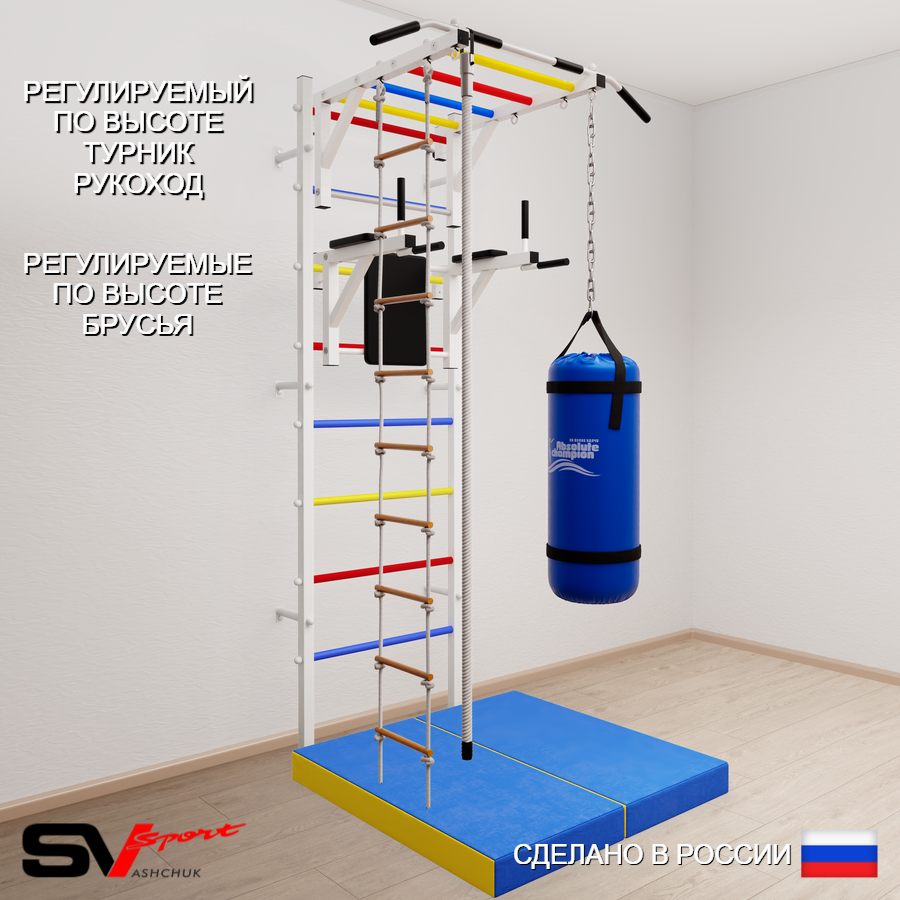 КОМПЛЕКТАЦИЯ: Шведская стенка Sv Sport усиленная (профиль вертикальных стоек 60 х 40 х 2 мм), Турник Sv Sport рукоход к ШС, Брусья Sv Sport к ШС, Kанат, Лестница веревочная, Цепь удлинитель 90см, Мешок боксерский 22кг, Спортивный мат 100 х 100 х 10 см складной.