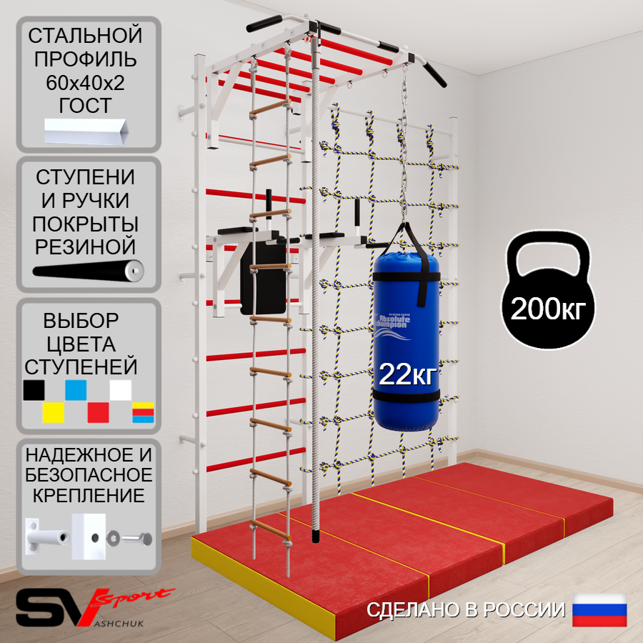 КОМПЛЕКТАЦИЯ: Шведская стенка Sv Sport усиленная (профиль вертикальных стоек 60 х 40 х 2 мм), Турник Sv Sport рукоход к ШС, Брусья Sv Sport к ШС, Kанат, Лестница веревочная, Цепь удлинитель 90см, Мешок боксерский 22кг, Спортивный мат 100 х 200 х 10 см складной, Канатный лаз.