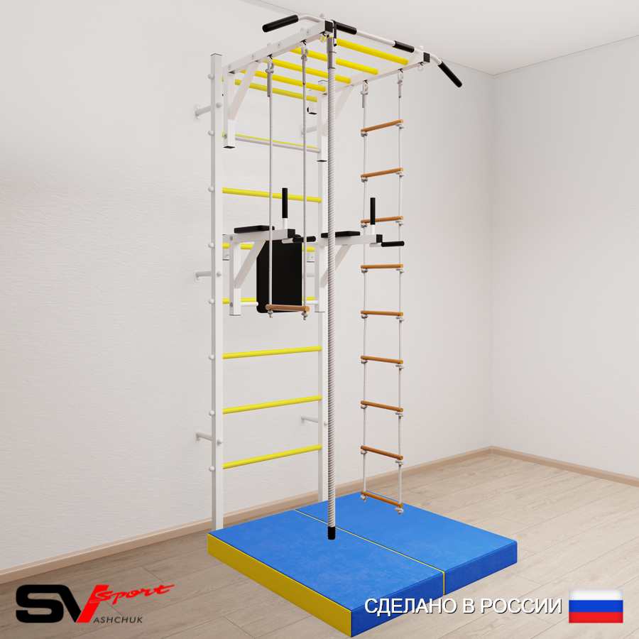КОМПЛЕКТАЦИЯ: Шведская стенка Sv Sport усиленная (профиль вертикальных стоек 60 х 40 х 2 мм), Турник Sv Sport рукоход к ШС, Брусья Sv Sport к ШС, Kанат, Трапеция, Лестница веревочная, Спортивный мат 100 х 100 х 10 см складной.