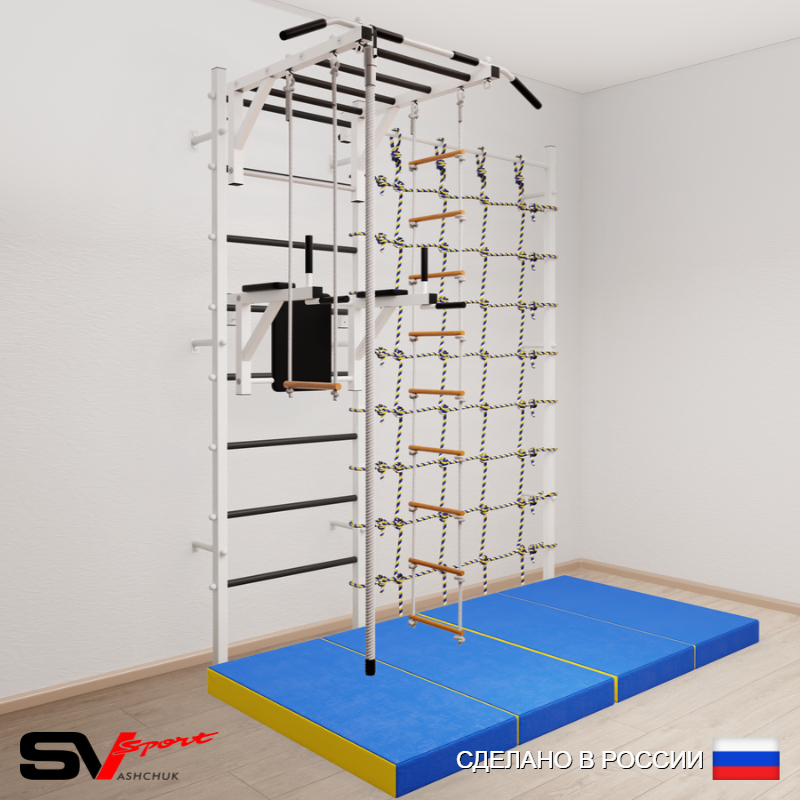 КОМПЛЕКТАЦИЯ: Шведская стенка Sv Sport усиленная (профиль вертикальных стоек 60 х 40 х 2 мм), Турник Sv Sport рукоход к ШС, Брусья Sv Sport к ШС, Kанат, Трапеция, Лестница веревочная, Спортивный мат 100 х 200 х 10 см складной, Канатный лаз.