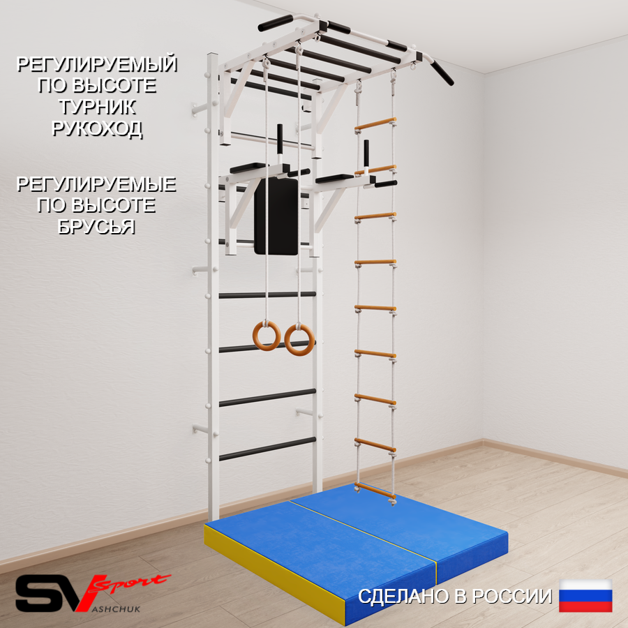 КОМПЛЕКТАЦИЯ: Шведская стенка Sv Sport усиленная (профиль вертикальных стоек 60 х 40 х 2 мм), Турник Sv Sport рукоход к ШС, Брусья Sv Sport к ШС, Kольца деревянные, Лестница веревочная, Спортивный мат 100 х 100 х 10 см складной.
