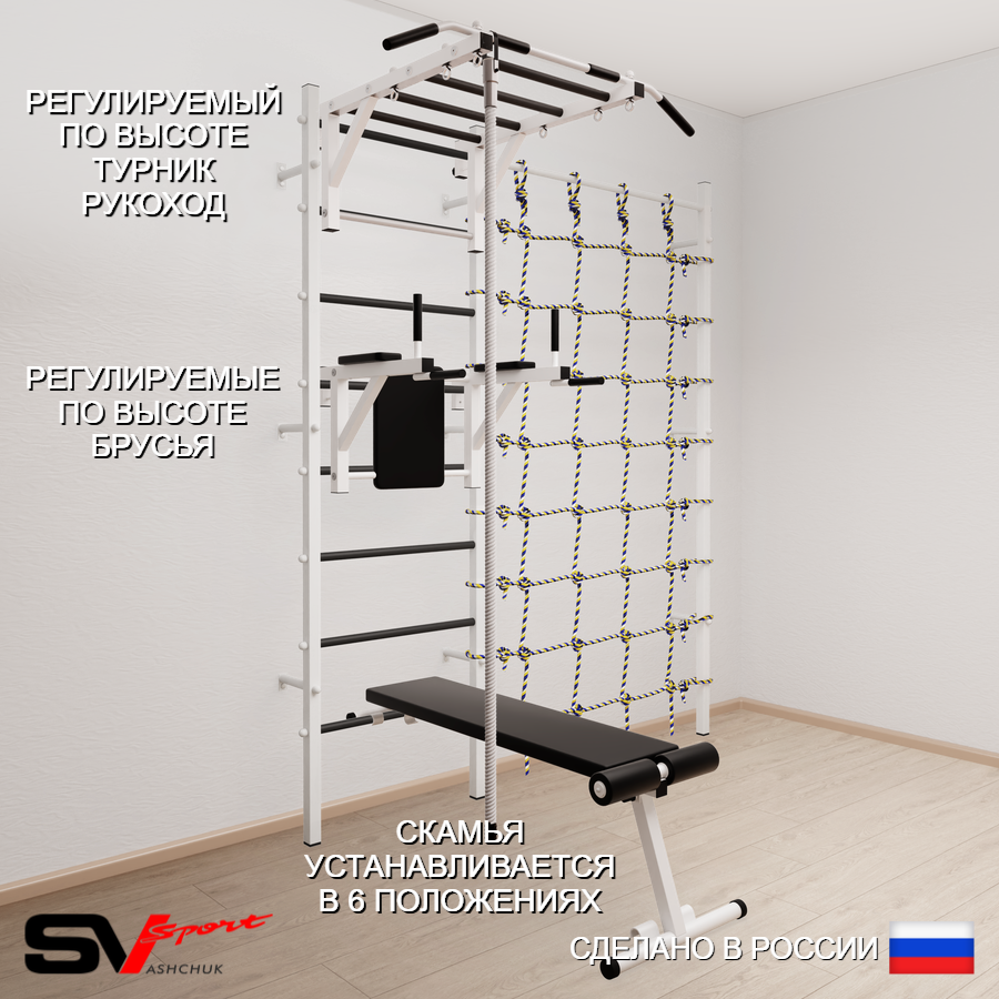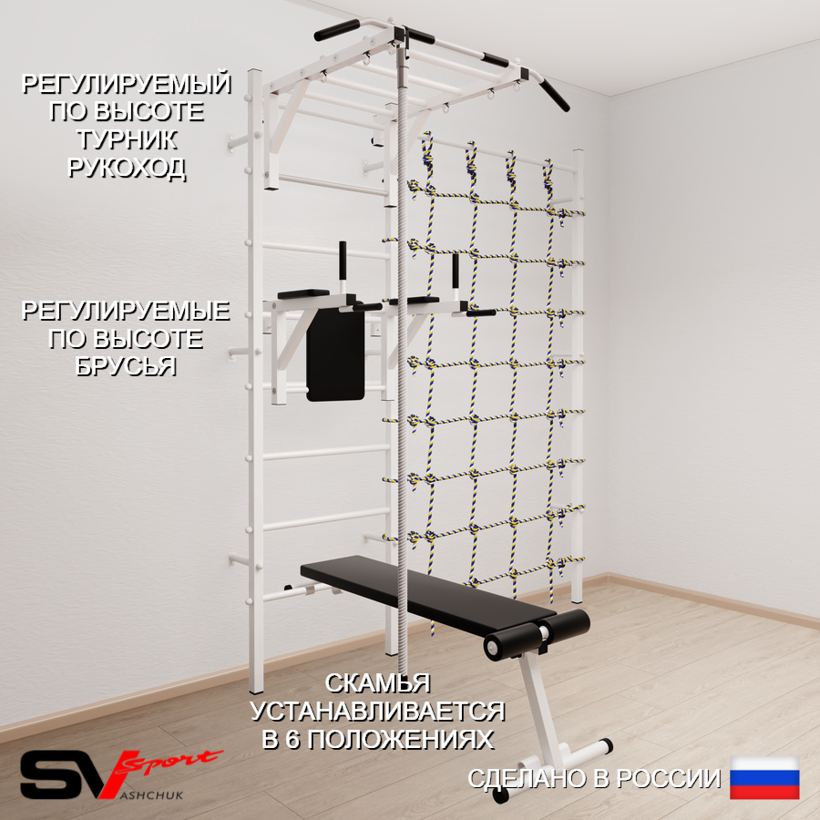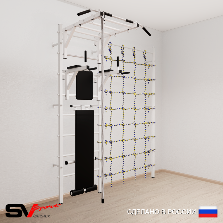 КОМПЛЕКТАЦИЯ: Шведская стенка Sv Sport усиленная (профиль вертикальных стоек 60 х 40 х 2 мм), Турник Sv Sport рукоход к ШС, Брусья Sv Sport к ШС, Скамья для пресса и жима Sv Sport к ШС, Kанат, Канатный лаз.