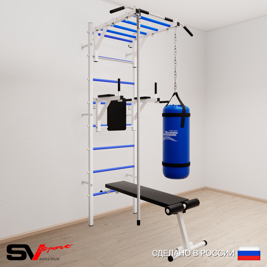 КОМПЛЕКТАЦИЯ: Шведская стенка Sv Sport усиленная (профиль вертикальных стоек 60 х 40 х 2 мм), Турник Sv Sport рукоход к ШС, Брусья Sv Sport к ШС, Скамья для пресса и жима Sv Sport к ШС, Kанат, Цепь удлинитель 90см, Мешок боксерский 30кг.