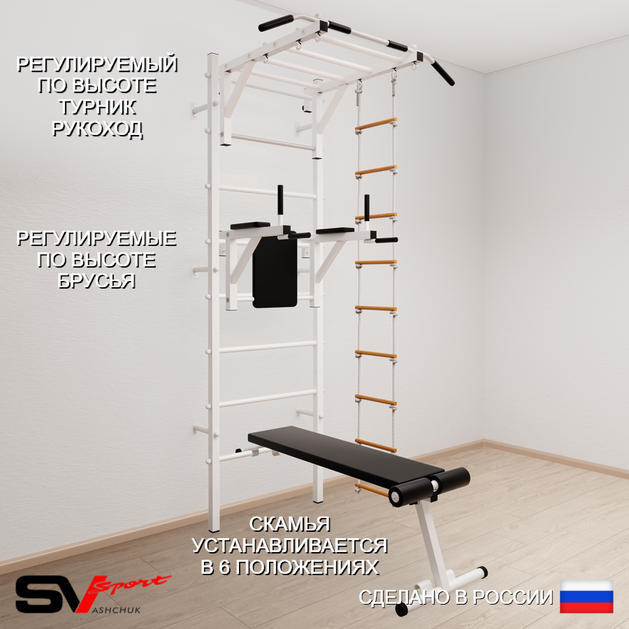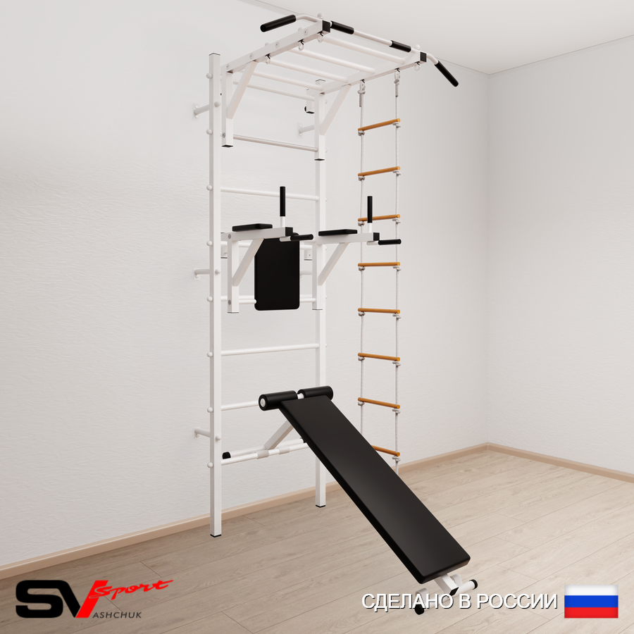 КОМПЛЕКТАЦИЯ: Шведская стенка Sv Sport усиленная (профиль вертикальных стоек 60 х 40 х 2 мм), Турник Sv Sport рукоход к ШС, Брусья Sv Sport к ШС, Скамья для пресса и жима Sv Sport к ШС, Лестница веревочная.