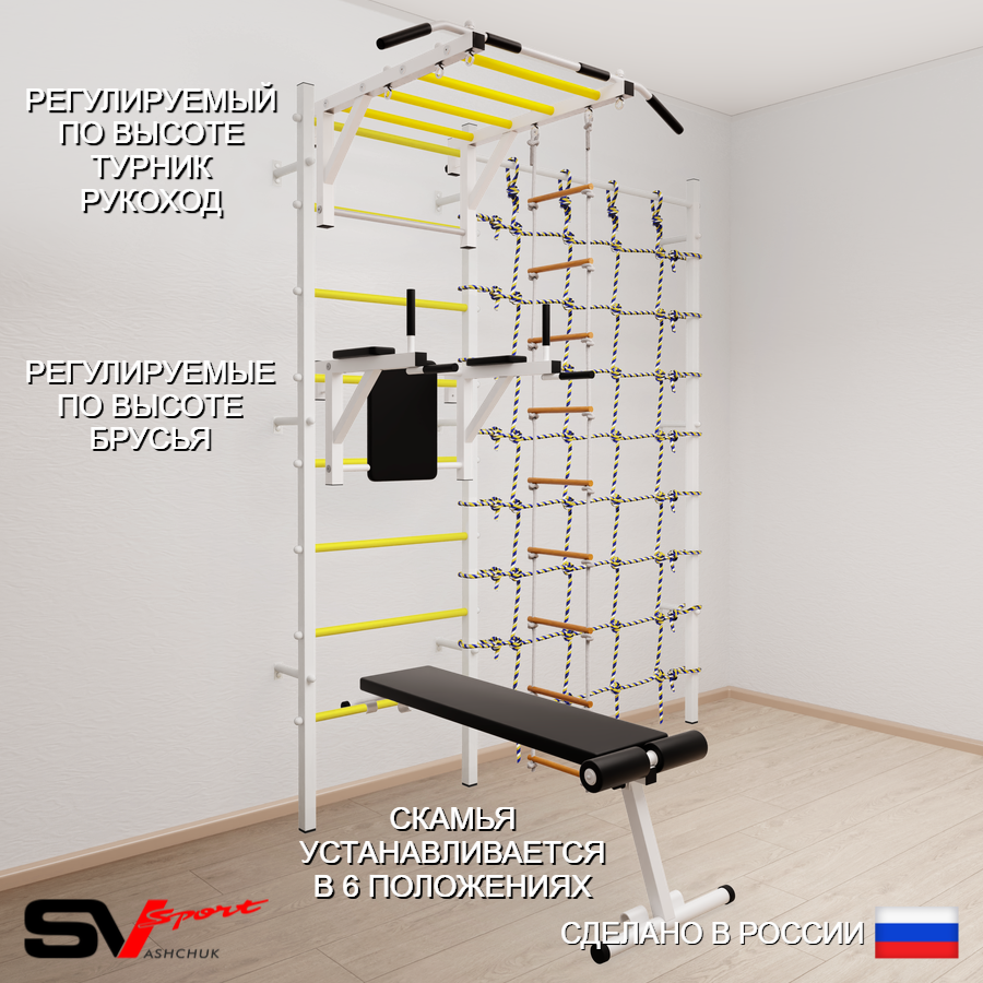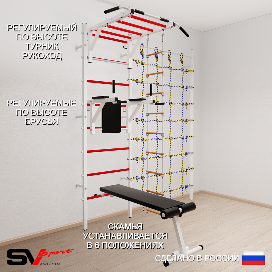 КОМПЛЕКТАЦИЯ: Шведская стенка Sv Sport усиленная (профиль вертикальных стоек 60 х 40 х 2 мм), Турник Sv Sport рукоход к ШС, Брусья Sv Sport к ШС, Скамья для пресса и жима Sv Sport к ШС, Лестница веревочная, Канатный лаз.