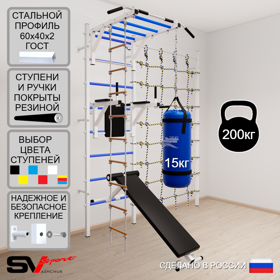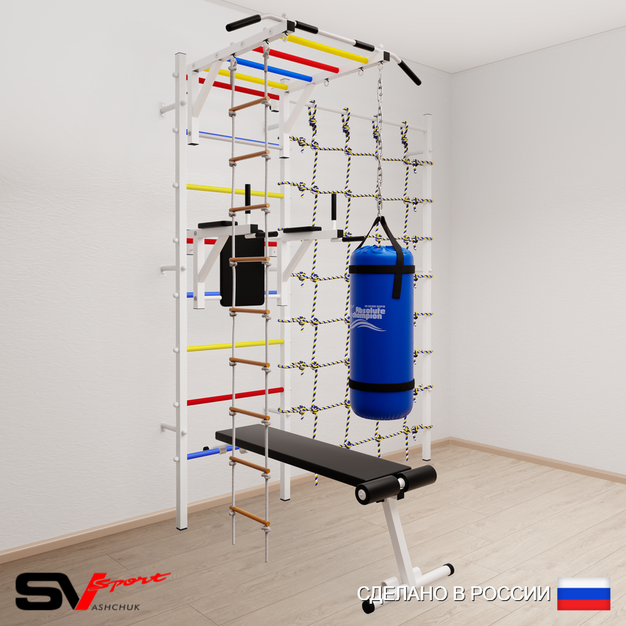 КОМПЛЕКТАЦИЯ: Шведская стенка Sv Sport усиленная (профиль вертикальных стоек 60 х 40 х 2 мм), Турник Sv Sport рукоход к ШС, Брусья Sv Sport к ШС, Скамья для пресса и жима Sv Sport к ШС, Лестница веревочная, Цепь удлинитель 90см, Мешок боксерский 15кг, Канатный лаз.