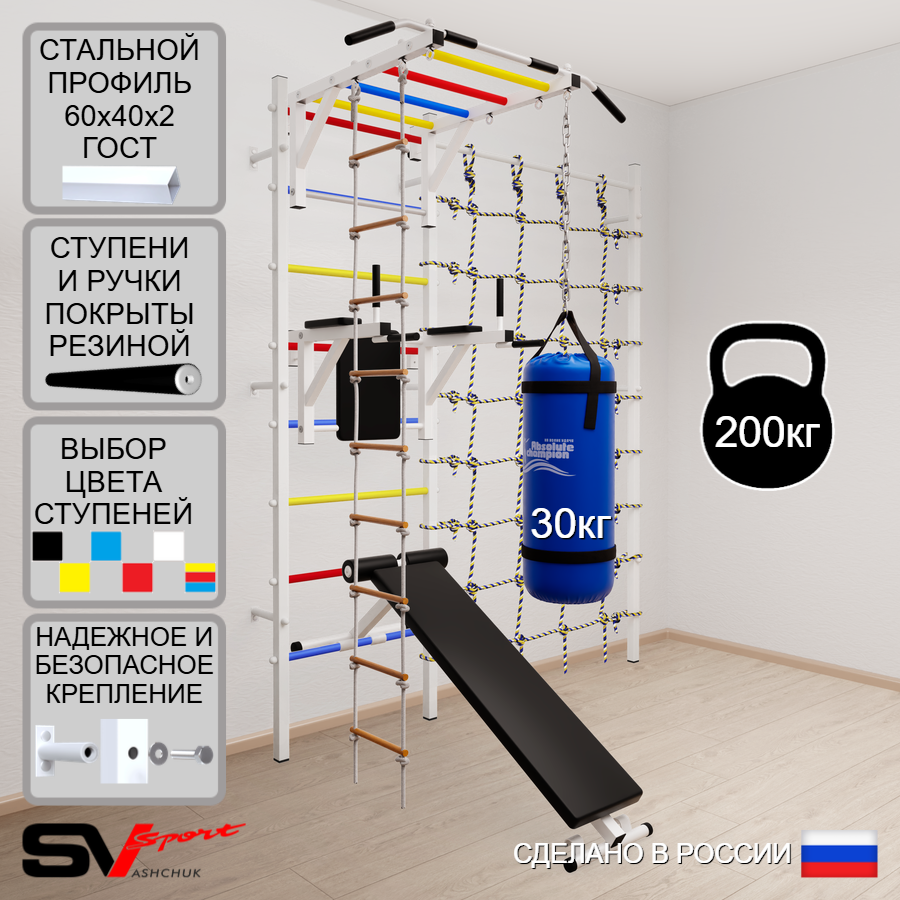 КОМПЛЕКТАЦИЯ: Шведская стенка Sv Sport усиленная (профиль вертикальных стоек 60 х 40 х 2 мм), Турник Sv Sport рукоход к ШС, Брусья Sv Sport к ШС, Скамья для пресса и жима Sv Sport к ШС, Лестница веревочная, Цепь удлинитель 90см, Мешок боксерский 30кг, Канатный лаз.