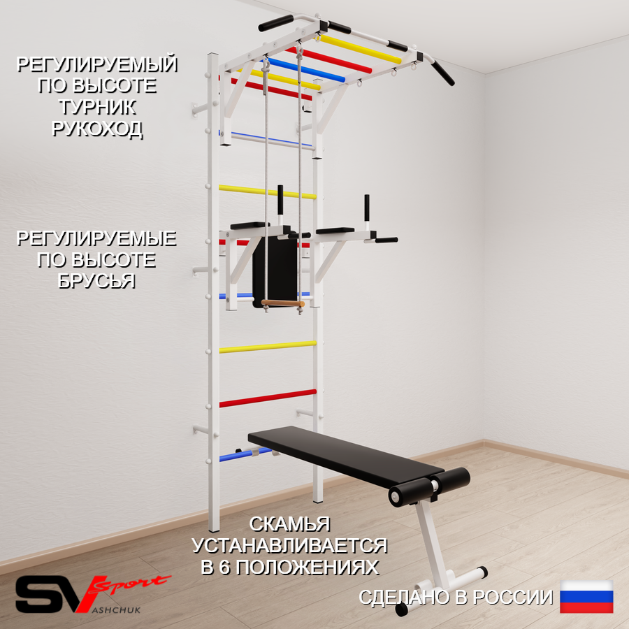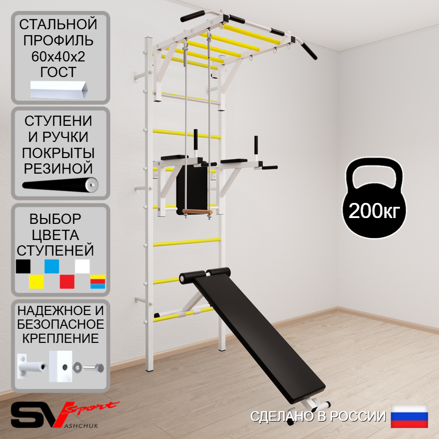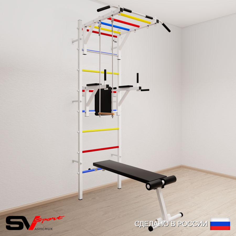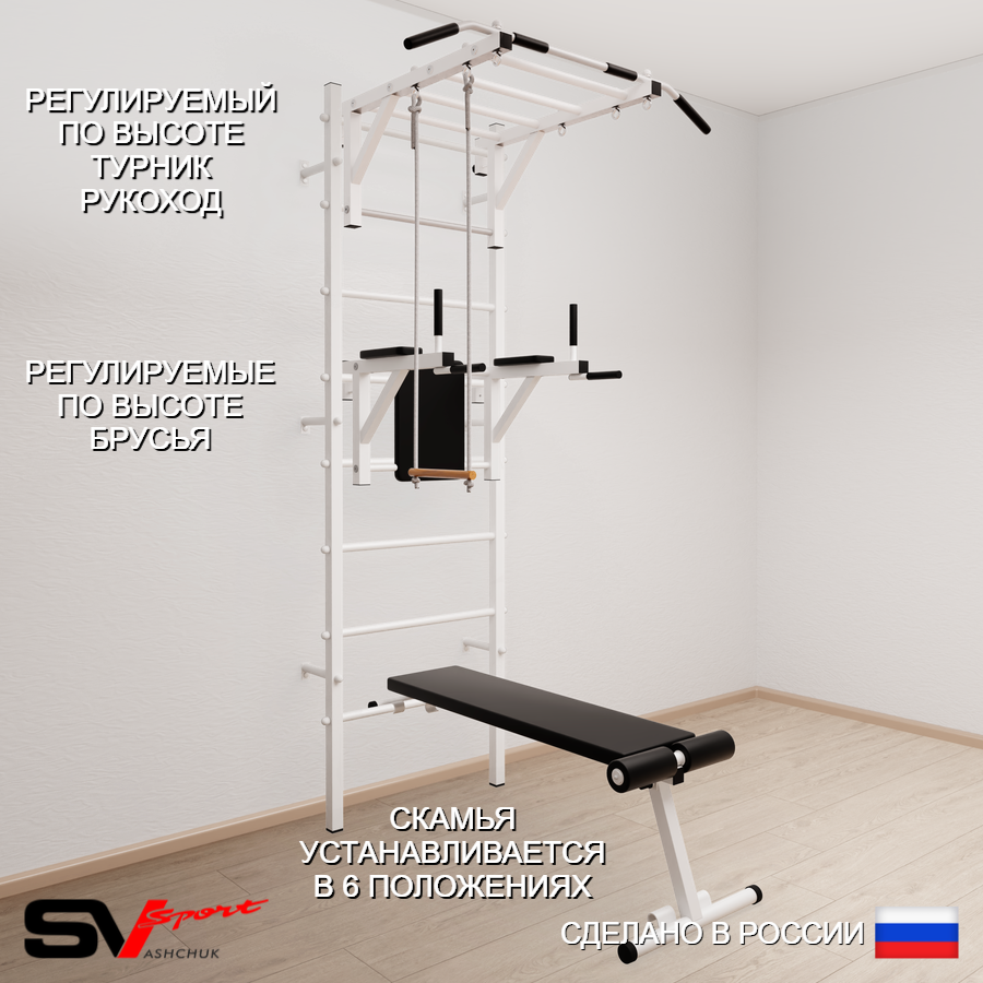КОМПЛЕКТАЦИЯ: Шведская стенка Sv Sport усиленная (профиль вертикальных стоек 60 х 40 х 2 мм), Турник Sv Sport рукоход к ШС, Брусья Sv Sport к ШС, Скамья для пресса и жима Sv Sport к ШС, Трапеция.