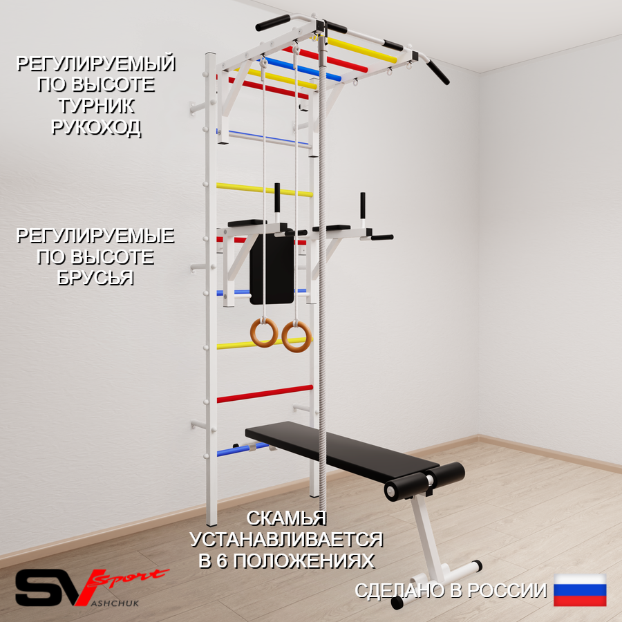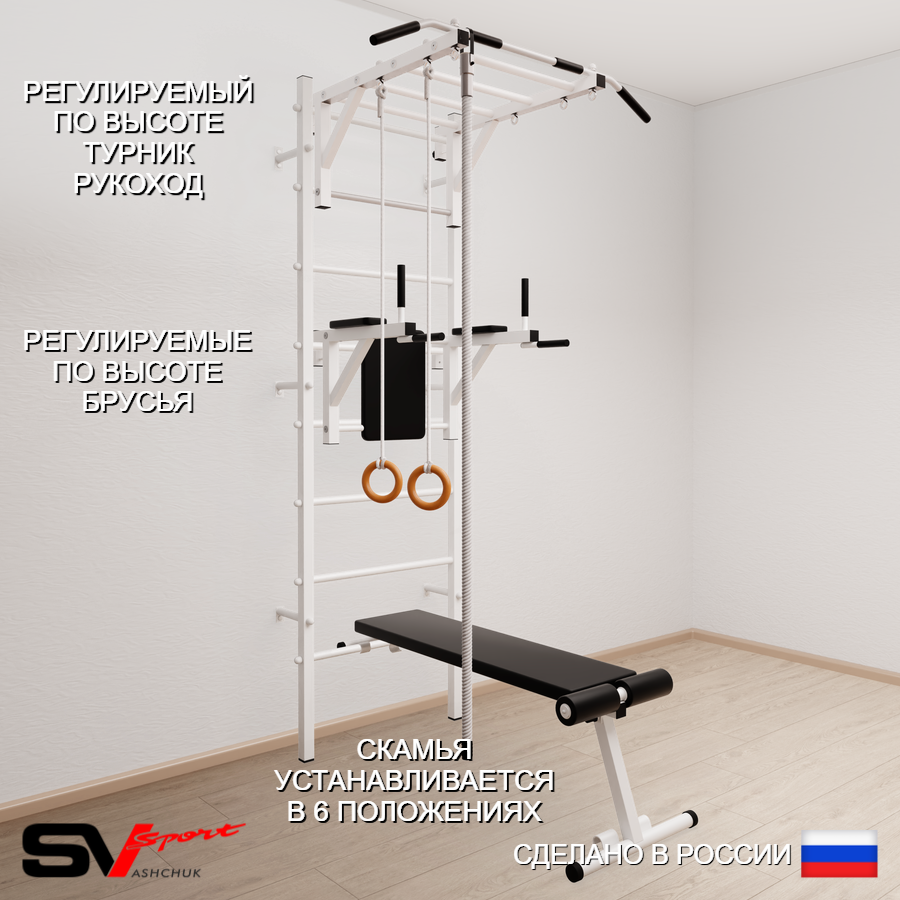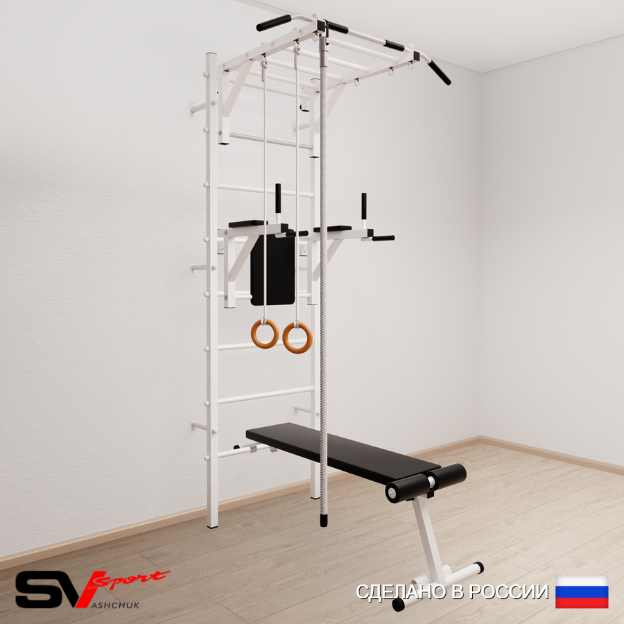 КОМПЛЕКТАЦИЯ: Шведская стенка Sv Sport усиленная (профиль вертикальных стоек 60 х 40 х 2 мм), Турник Sv Sport рукоход к ШС, Брусья Sv Sport к ШС, Скамья для пресса и жима Sv Sport к ШС, Kанат, Kольца деревянные.