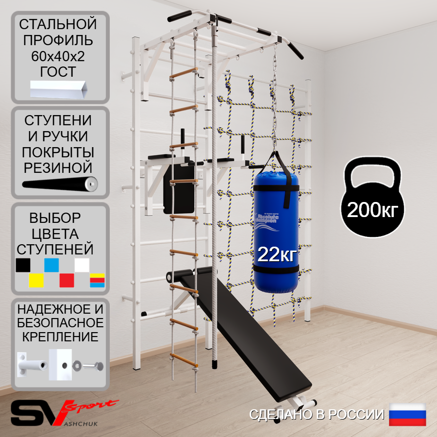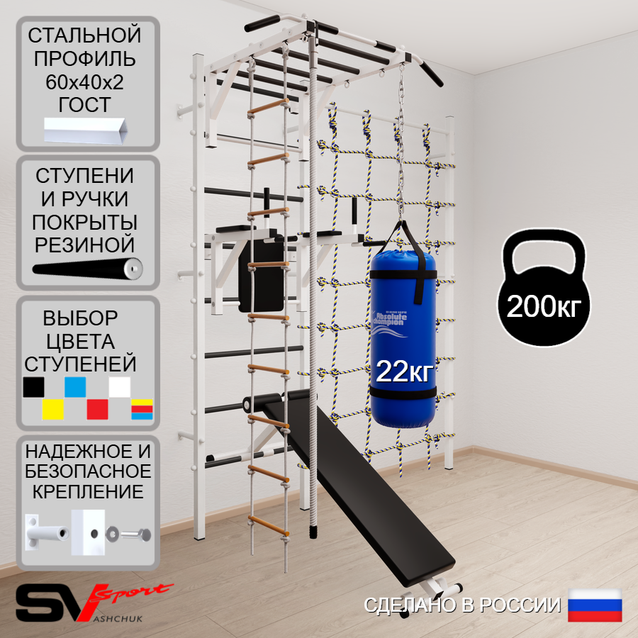 КОМПЛЕКТАЦИЯ: Шведская стенка Sv Sport усиленная (профиль вертикальных стоек 60 х 40 х 2 мм), Турник Sv Sport рукоход к ШС, Брусья Sv Sport к ШС, Скамья для пресса и жима Sv Sport к ШС, Kанат, Лестница веревочная, Цепь удлинитель 90см, Мешок боксерский 22кг, Канатный лаз.