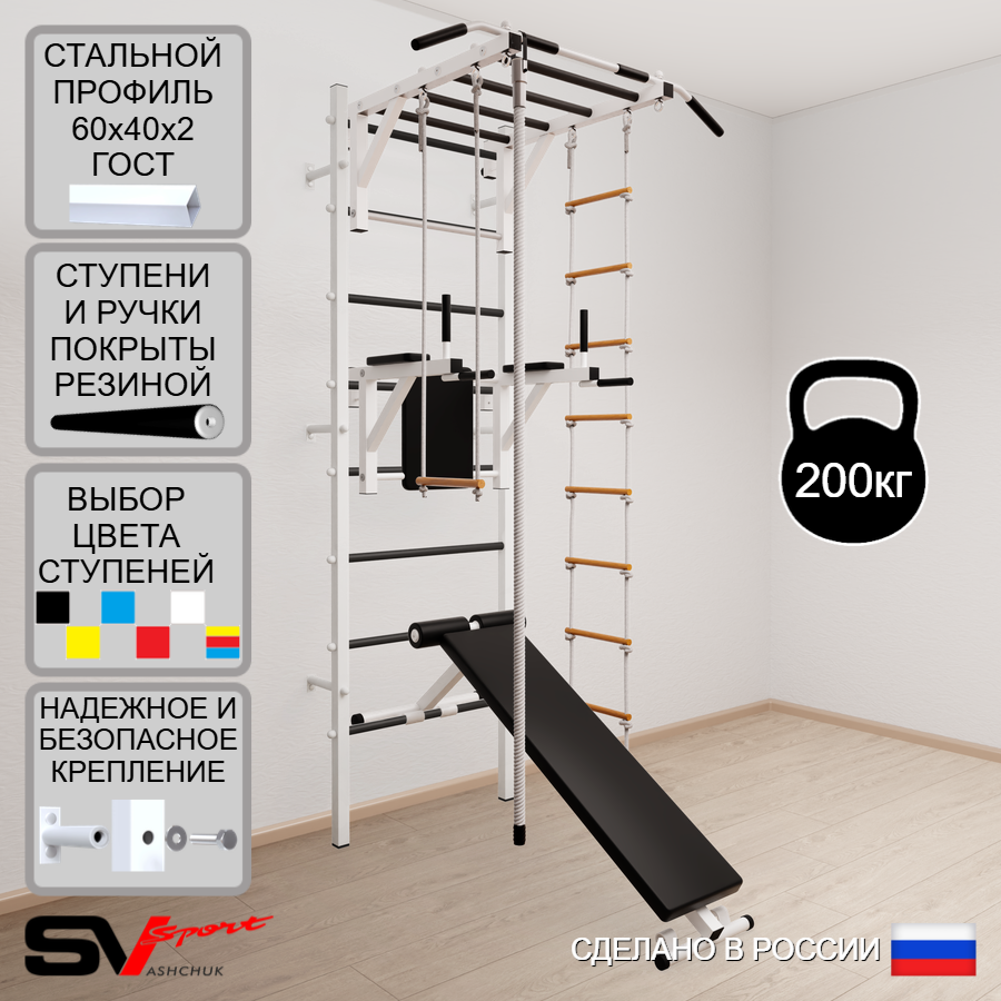 КОМПЛЕКТАЦИЯ: Шведская стенка Sv Sport усиленная (профиль вертикальных стоек 60 х 40 х 2 мм), Турник Sv Sport рукоход к ШС, Брусья Sv Sport к ШС, Скамья для пресса и жима Sv Sport к ШС, Kанат, Трапеция, Лестница веревочная.