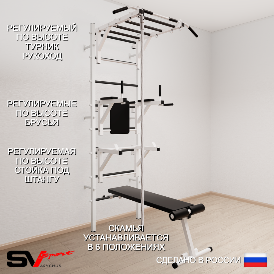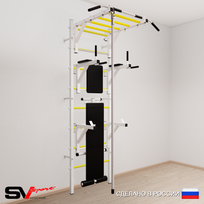КОМПЛЕКТАЦИЯ: Шведская стенка Sv Sport усиленная (профиль вертикальных стоек 60 х 40 х 2 мм), Турник Sv Sport рукоход к ШС, Брусья Sv Sport к ШС, Стойка под штангу Sv Sport к ШС, Скамья для пресса и жима Sv Sport к ШС, Kанат.