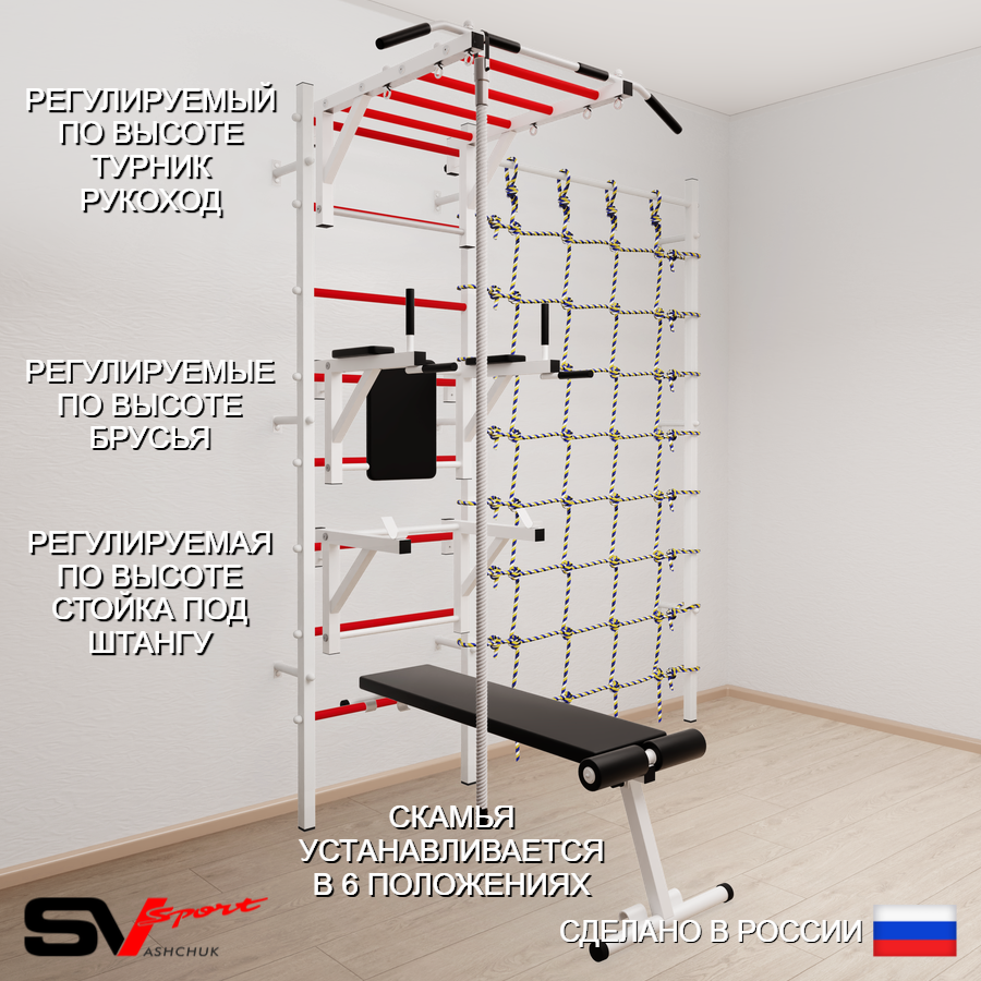 КОМПЛЕКТАЦИЯ: Шведская стенка Sv Sport усиленная (профиль вертикальных стоек 60 х 40 х 2 мм), Турник Sv Sport рукоход к ШС, Брусья Sv Sport к ШС, Стойка под штангу Sv Sport к ШС, Скамья для пресса и жима Sv Sport к ШС, Kанат, Канатный лаз.