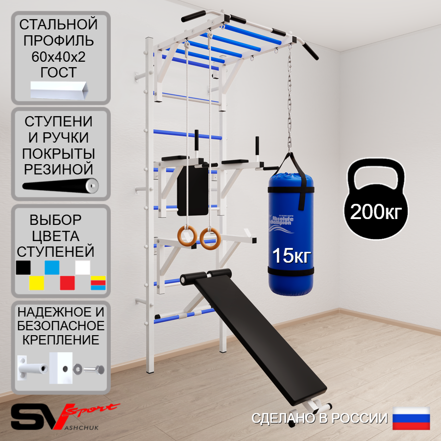 КОМПЛЕКТАЦИЯ: Шведская стенка Sv Sport усиленная (профиль вертикальных стоек 60 х 40 х 2 мм), Турник Sv Sport рукоход к ШС, Брусья Sv Sport к ШС, Стойка под штангу Sv Sport к ШС, Скамья для пресса и жима Sv Sport к ШС, Kольца деревянные, Цепь удлинитель 90см, Мешок боксерский 15кг.