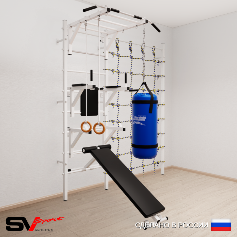 КОМПЛЕКТАЦИЯ: Шведская стенка Sv Sport усиленная (профиль вертикальных стоек 60 х 40 х 2 мм), Турник Sv Sport рукоход к ШС, Брусья Sv Sport к ШС, Стойка под штангу Sv Sport к ШС, Скамья для пресса и жима Sv Sport к ШС, Kольца деревянные, Цепь удлинитель 90см, Мешок боксерский 15кг, Канатный лаз.