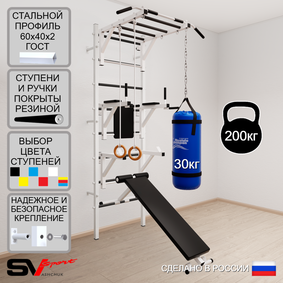 КОМПЛЕКТАЦИЯ: Шведская стенка Sv Sport усиленная (профиль вертикальных стоек 60 х 40 х 2 мм), Турник Sv Sport рукоход к ШС, Брусья Sv Sport к ШС, Стойка под штангу Sv Sport к ШС, Скамья для пресса и жима Sv Sport к ШС, Kольца деревянные, Цепь удлинитель 90см, Мешок боксерский 30кг.