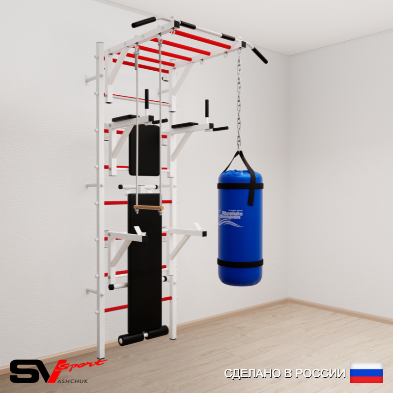 КОМПЛЕКТАЦИЯ: Шведская стенка Sv Sport усиленная (профиль вертикальных стоек 60 х 40 х 2 мм), Турник Sv Sport рукоход к ШС, Брусья Sv Sport к ШС, Стойка под штангу Sv Sport к ШС, Скамья для пресса и жима Sv Sport к ШС, Трапеция, Цепь удлинитель 90см, Мешок боксерский 15кг.