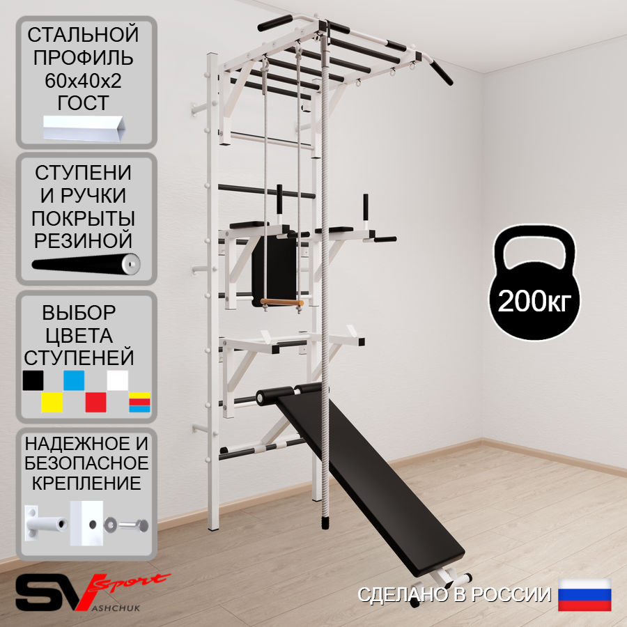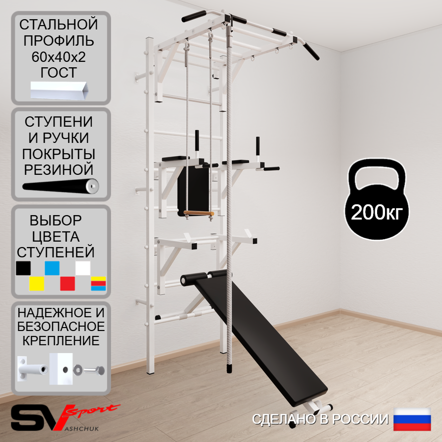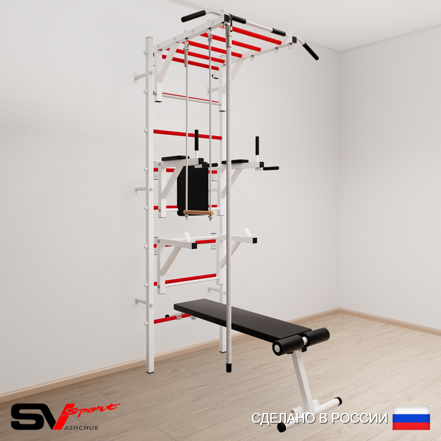 КОМПЛЕКТАЦИЯ: Шведская стенка Sv Sport усиленная (профиль вертикальных стоек 60 х 40 х 2 мм), Турник Sv Sport рукоход к ШС, Брусья Sv Sport к ШС, Стойка под штангу Sv Sport к ШС, Скамья для пресса и жима Sv Sport к ШС, Kанат, Трапеция.