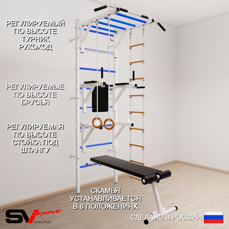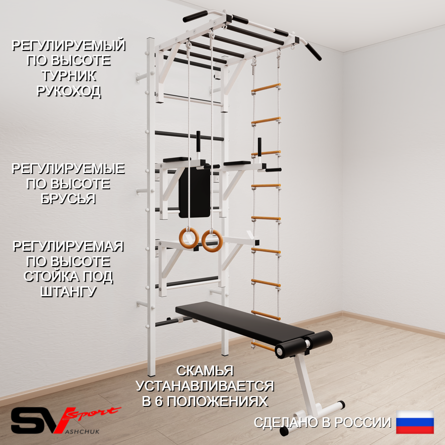 КОМПЛЕКТАЦИЯ: Шведская стенка Sv Sport усиленная (профиль вертикальных стоек 60 х 40 х 2 мм), Турник Sv Sport рукоход к ШС, Брусья Sv Sport к ШС, Стойка под штангу Sv Sport к ШС, Скамья для пресса и жима Sv Sport к ШС, Kольца деревянные, Лестница веревочная.