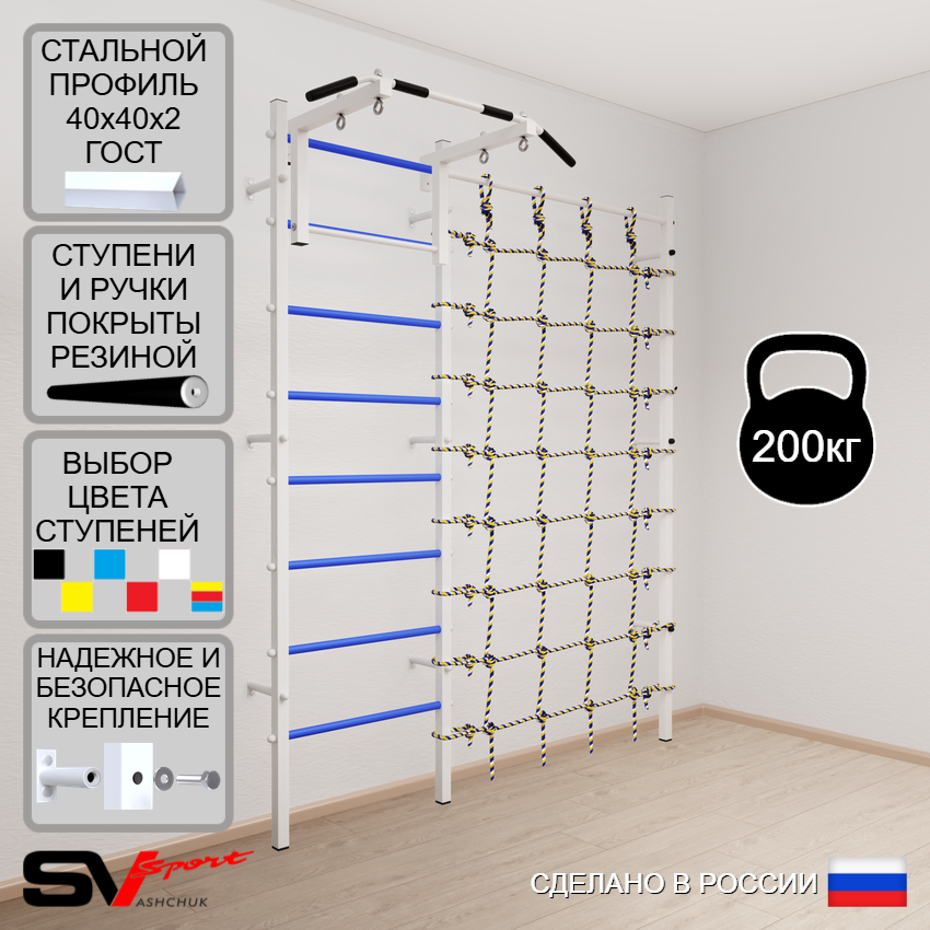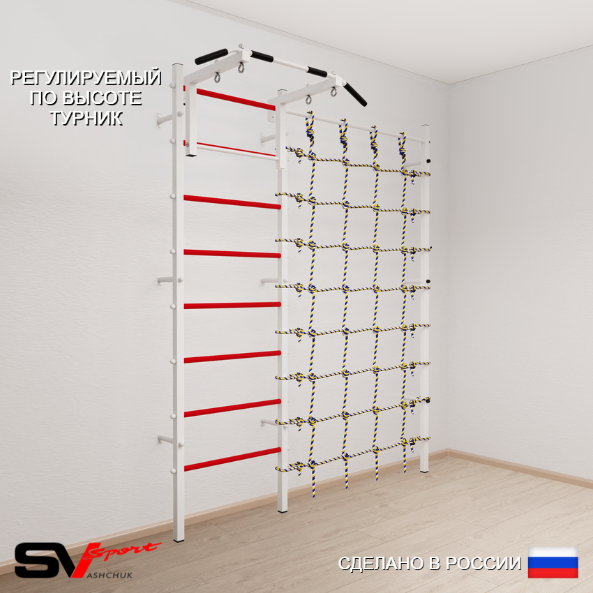 КОМПЛЕКТАЦИЯ: Шведская стенка Sv Sport (профиль вертикальных стоек 40 х 40 х 2 мм), Турник Sv Sport стандарт к ШС, Канатный лаз.