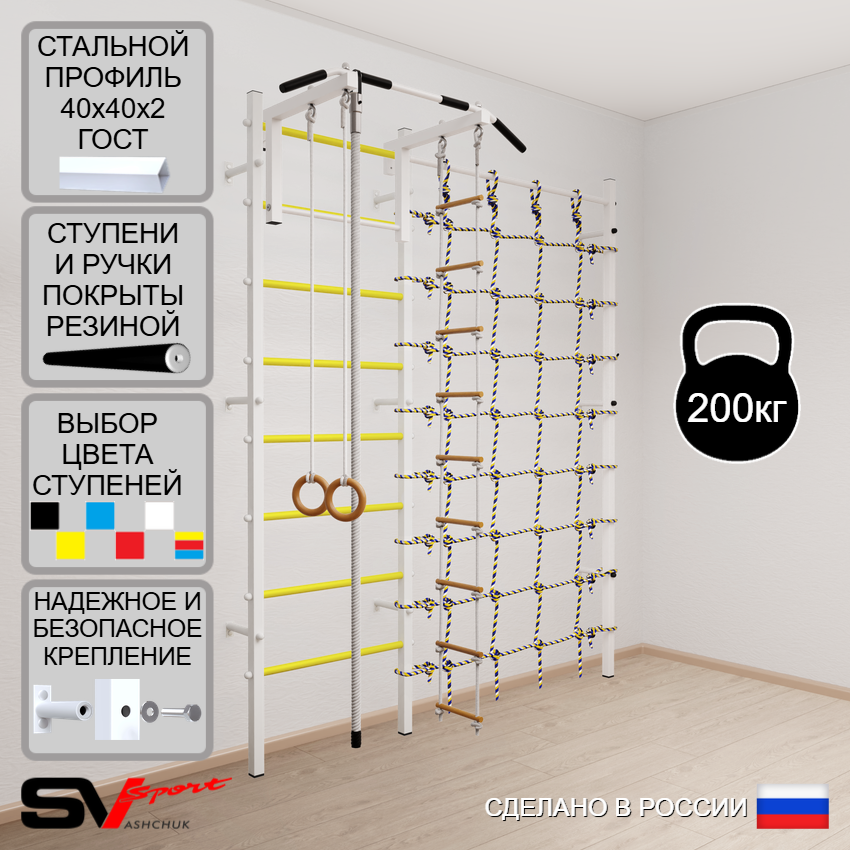 КОМПЛЕКТАЦИЯ: Шведская стенка Sv Sport (профиль вертикальных стоек 40 х 40 х 2 мм), Турник Sv Sport стандарт к ШС, Kанат, Kольца деревянные, Лестница веревочная, Канатный лаз.