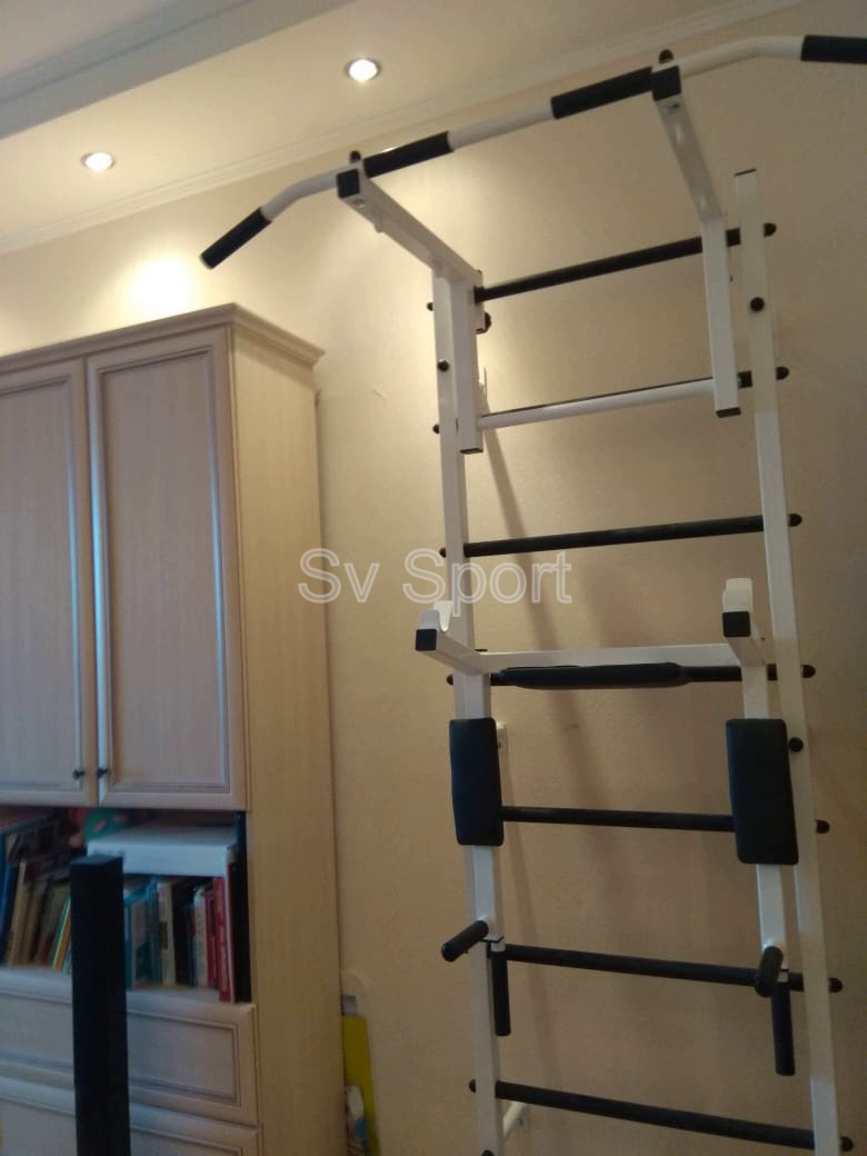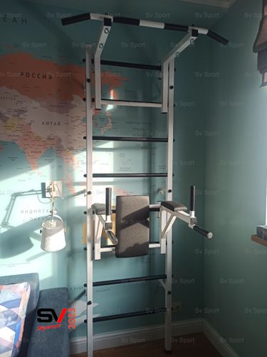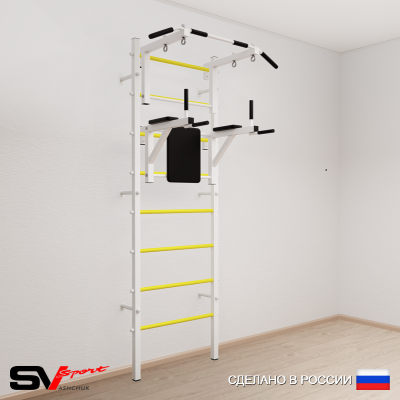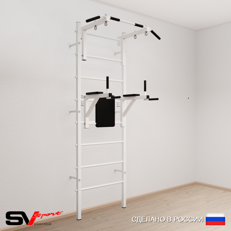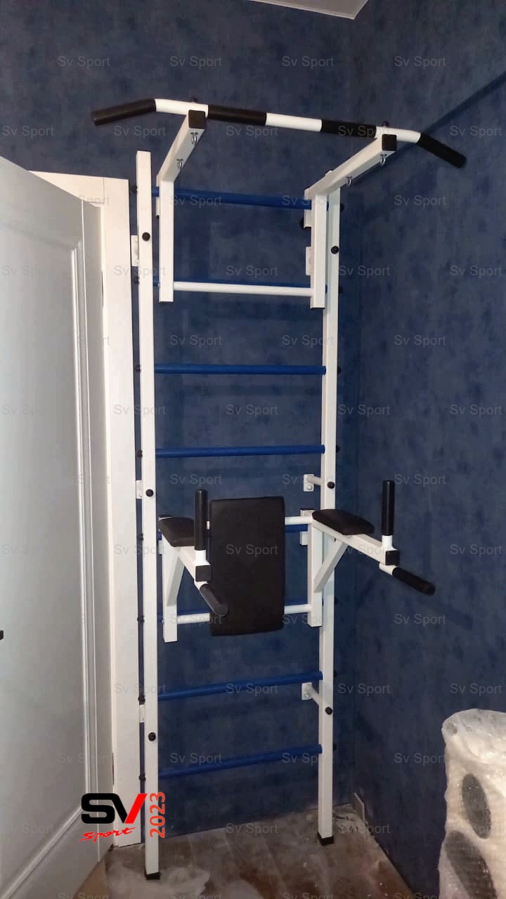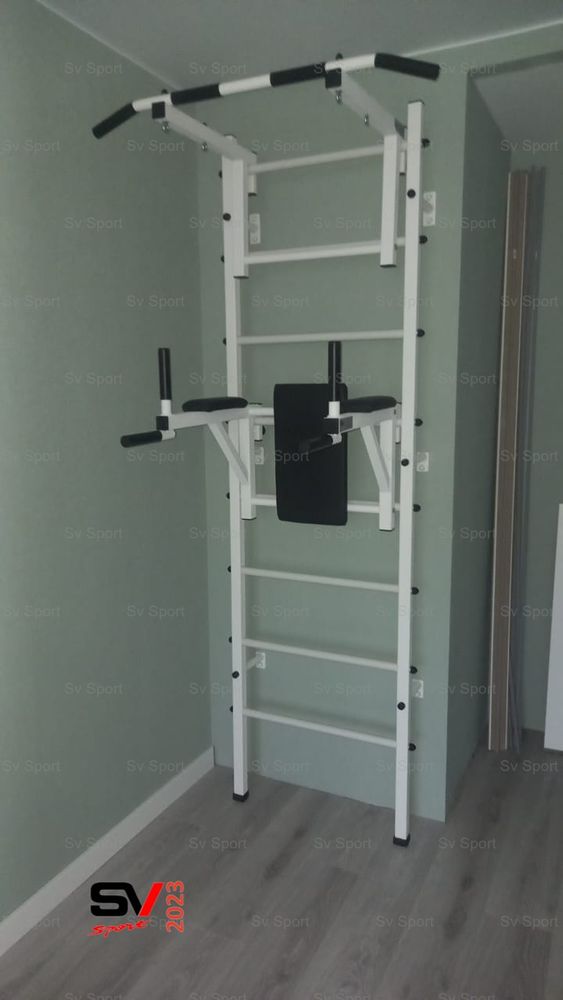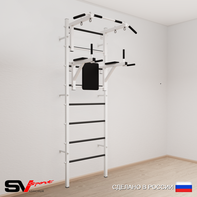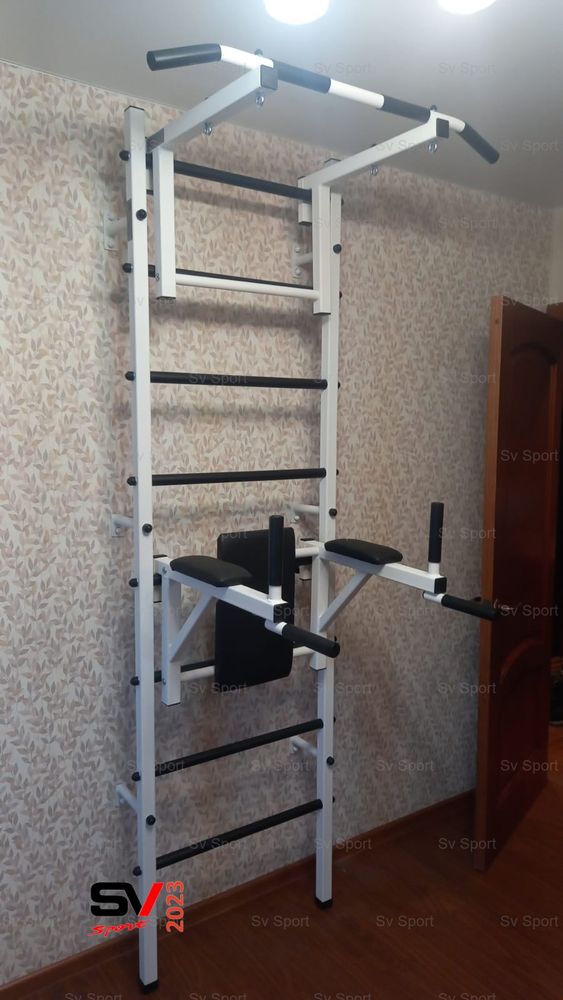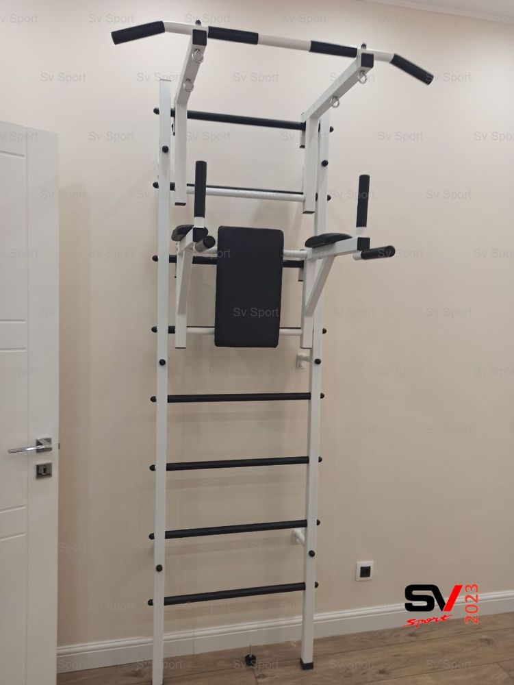 КОМПЛЕКТАЦИЯ: Шведская стенка Sv Sport (профиль вертикальных стоек 40 х 40 х 2 мм), Турник Sv Sport стандарт к ШС, Брусья Sv Sport к ШС.