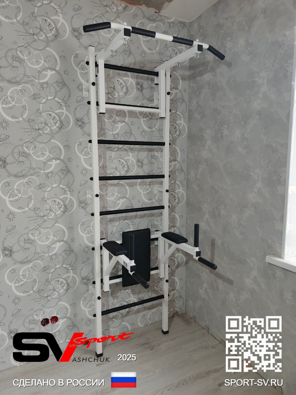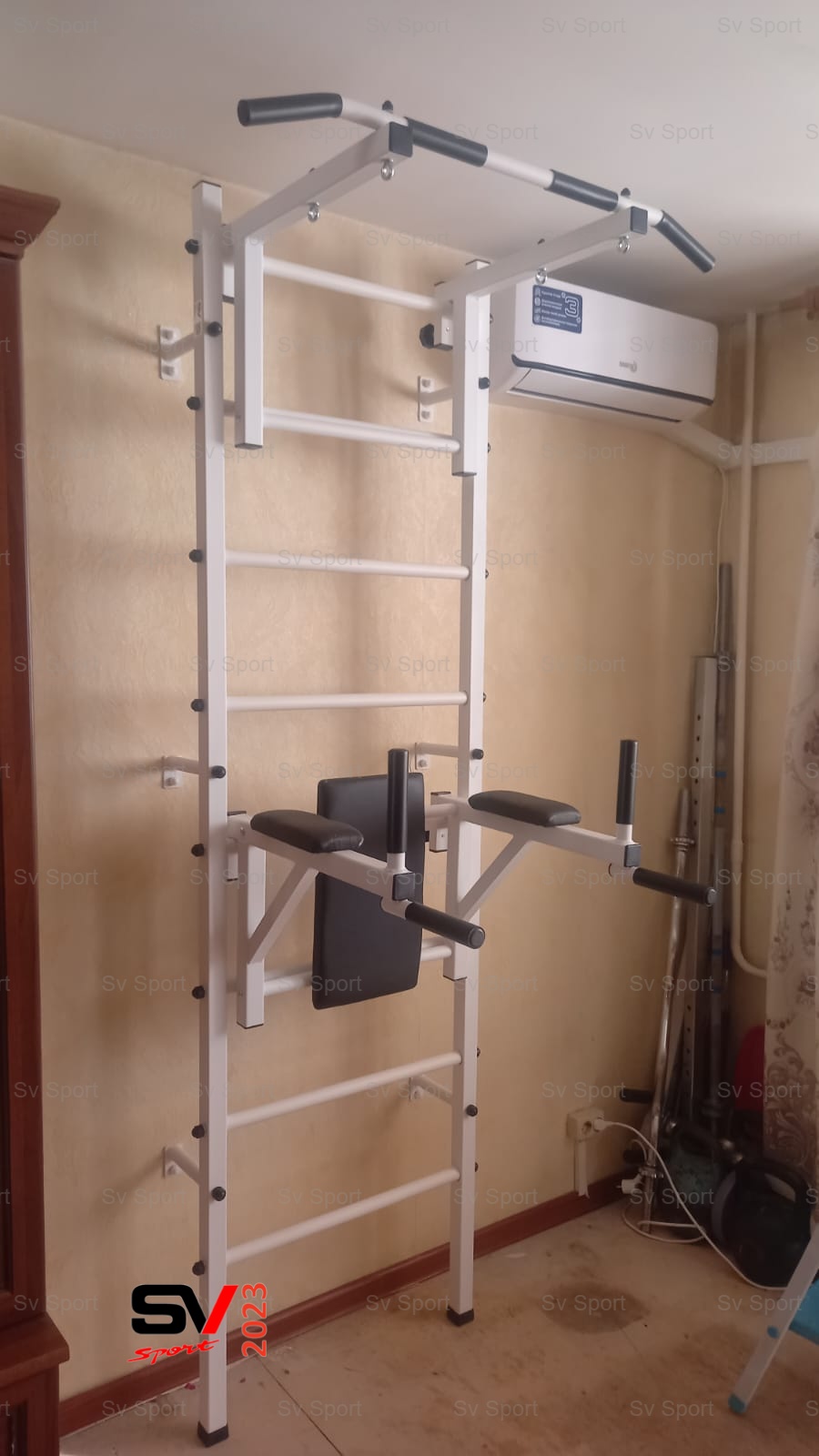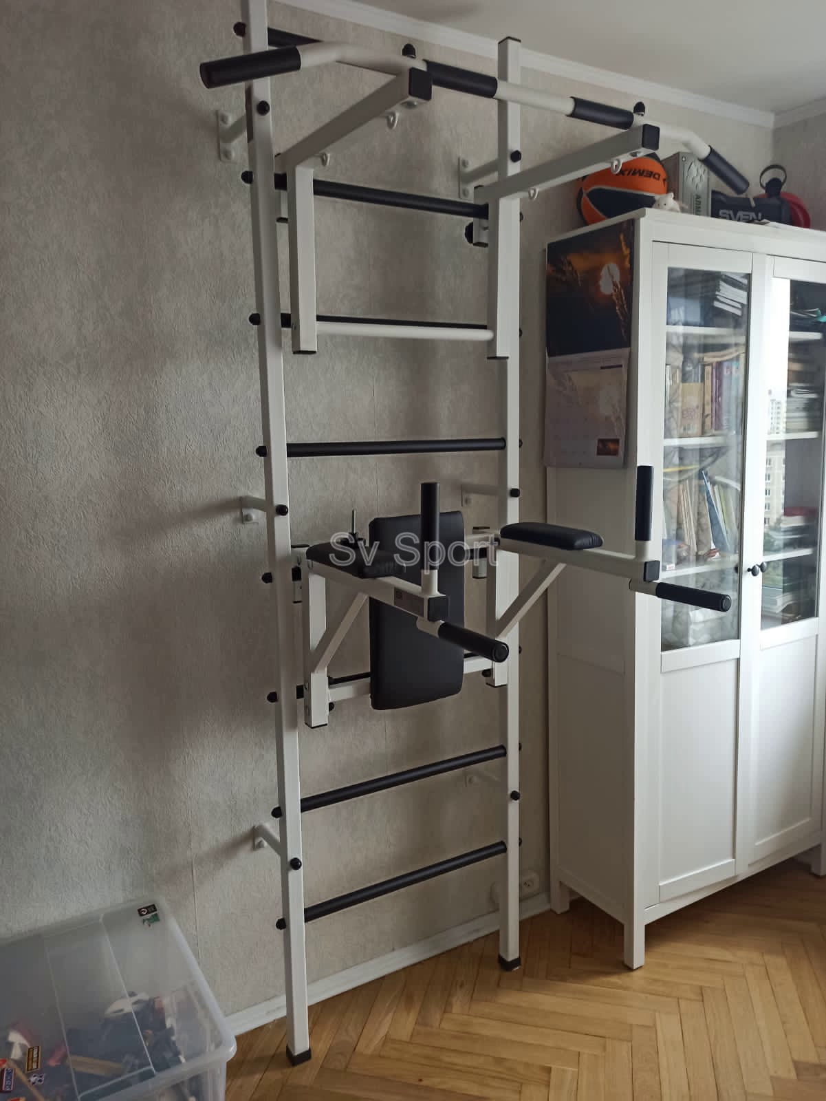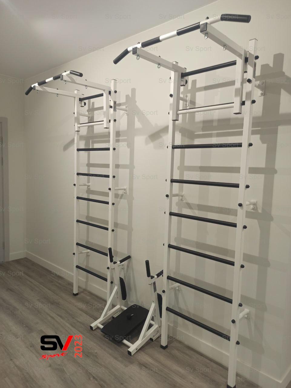 КОМПЛЕКТАЦИЯ: Шведская стенка Sv Sport (профиль вертикальных стоек 40 х 40 х 2 мм), Турник Sv Sport стандарт к ШС, Брусья Sv Sport к ШС.