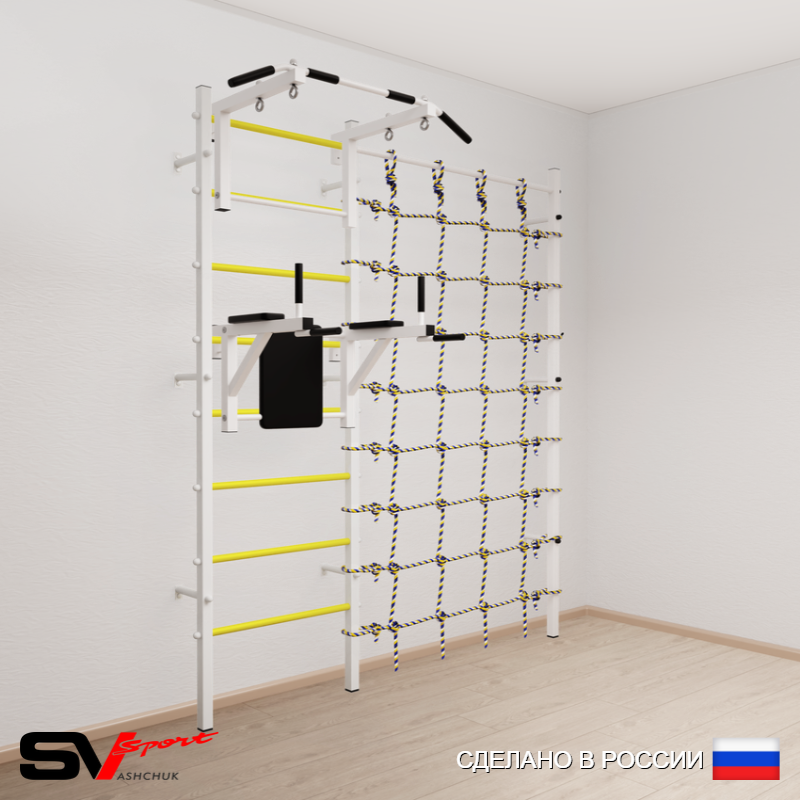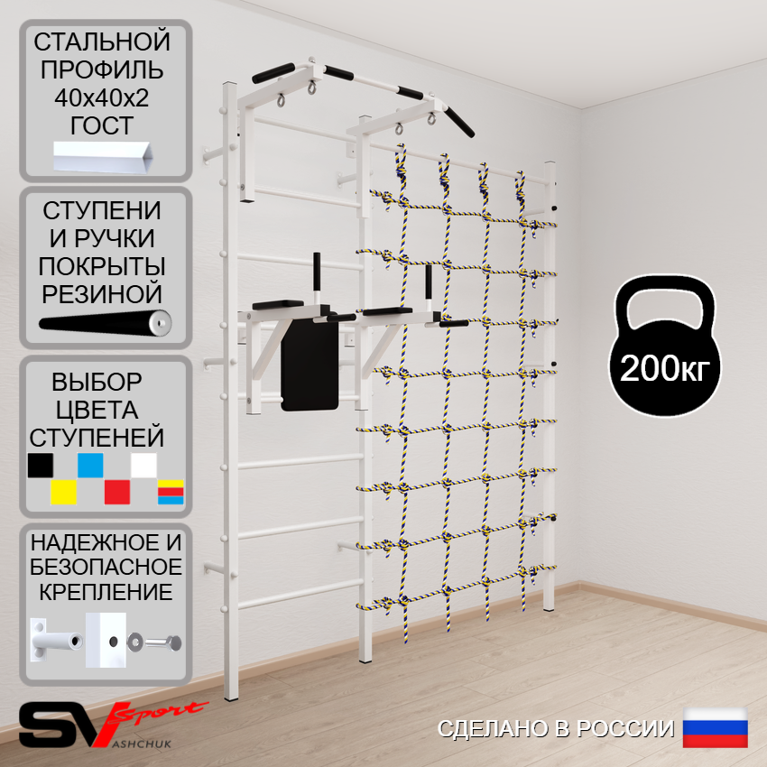 КОМПЛЕКТАЦИЯ: Шведская стенка Sv Sport (профиль вертикальных стоек 40 х 40 х 2 мм), Турник Sv Sport стандарт к ШС, Брусья Sv Sport к ШС, Канатный лаз.