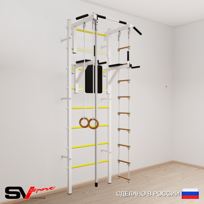 КОМПЛЕКТАЦИЯ: Шведская стенка Sv Sport (профиль вертикальных стоек 40 х 40 х 2 мм), Турник Sv Sport стандарт к ШС, Брусья Sv Sport к ШС, Kанат, Kольца деревянные, Лестница веревочная.