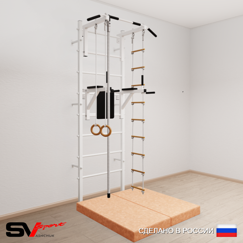 КОМПЛЕКТАЦИЯ: Шведская стенка Sv Sport (профиль вертикальных стоек 40 х 40 х 2 мм), Турник Sv Sport стандарт к ШС, Брусья Sv Sport к ШС, Kанат, Kольца деревянные, Лестница веревочная, Спортивный мат 100 х 100 х 10 см складной.