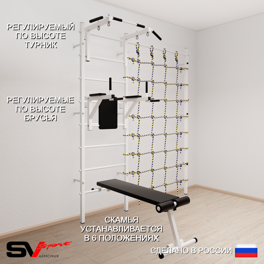 КОМПЛЕКТАЦИЯ: Шведская стенка Sv Sport (профиль вертикальных стоек 40 х 40 х 2 мм), Турник Sv Sport стандарт к ШС, Брусья Sv Sport к ШС, Скамья для пресса и жима Sv Sport к ШС, Канатный лаз.