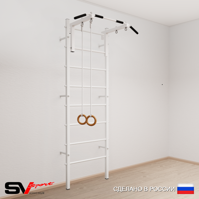 КОМПЛЕКТАЦИЯ: Шведская стенка Sv Sport (профиль вертикальных стоек 40 х 40 х 2 мм), Турник Sv Sport стандарт к ШС, Kольца деревянные.