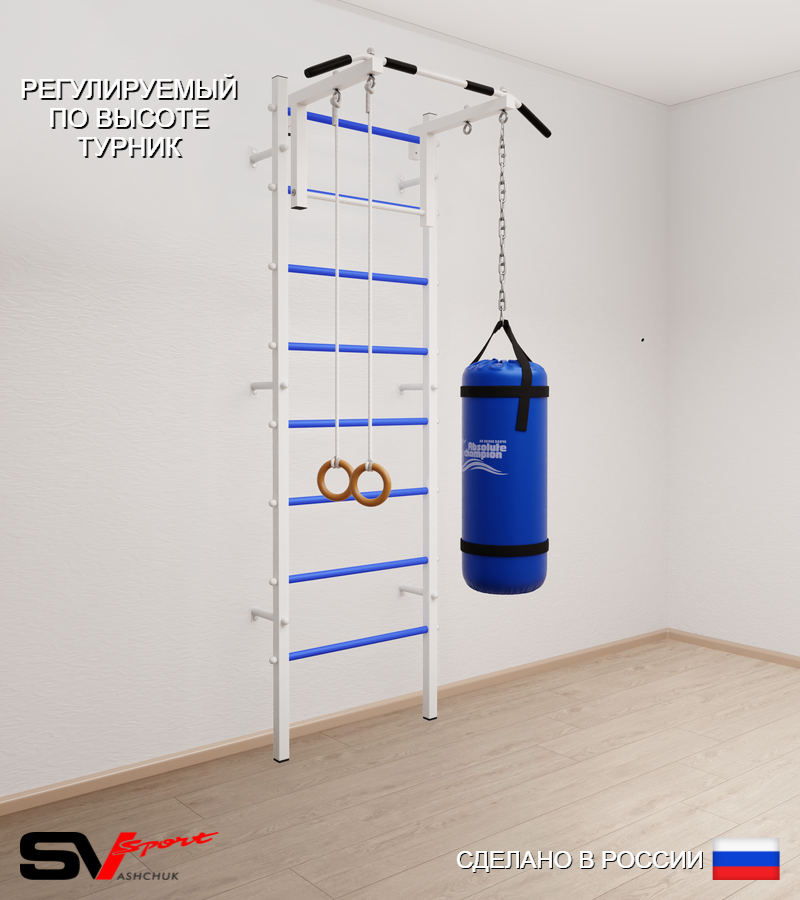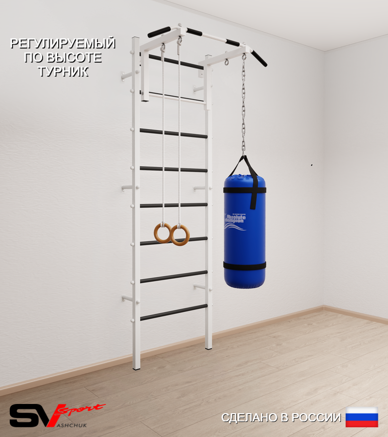 КОМПЛЕКТАЦИЯ: Шведская стенка Sv Sport (профиль вертикальных стоек 40 х 40 х 2 мм), Турник Sv Sport стандарт к ШС, Kольца деревянные, Цепь удлинитель 90см, Мешок боксерский 30кг.