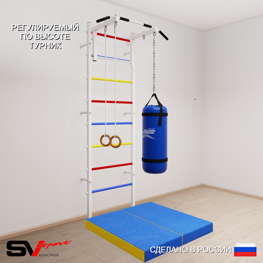 КОМПЛЕКТАЦИЯ: Шведская стенка Sv Sport (профиль вертикальных стоек 40 х 40 х 2 мм), Турник Sv Sport стандарт к ШС, Kольца деревянные, Цепь удлинитель 90см, Мешок боксерский 15кг, Спортивный мат 100 х 100 х 10 см складной.