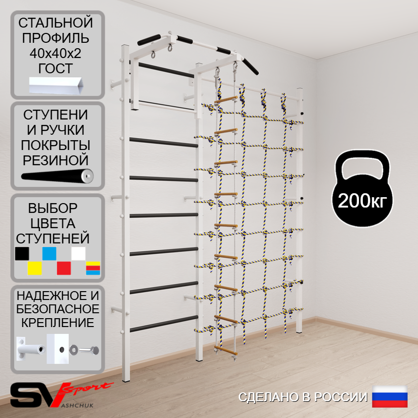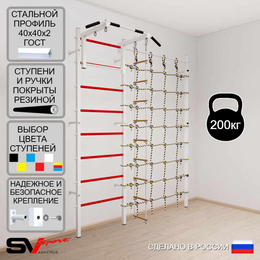 КОМПЛЕКТАЦИЯ: Шведская стенка Sv Sport (профиль вертикальных стоек 40 х 40 х 2 мм), Турник Sv Sport стандарт к ШС, Лестница веревочная, Канатный лаз.