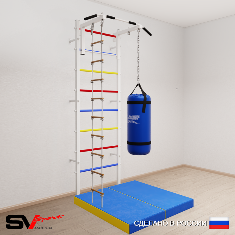 КОМПЛЕКТАЦИЯ: Шведская стенка Sv Sport (профиль вертикальных стоек 40 х 40 х 2 мм), Турник Sv Sport стандарт к ШС, Лестница веревочная, Цепь удлинитель 90см, Мешок боксерский 30кг, Спортивный мат 100 х 100 х 10 см складной.
