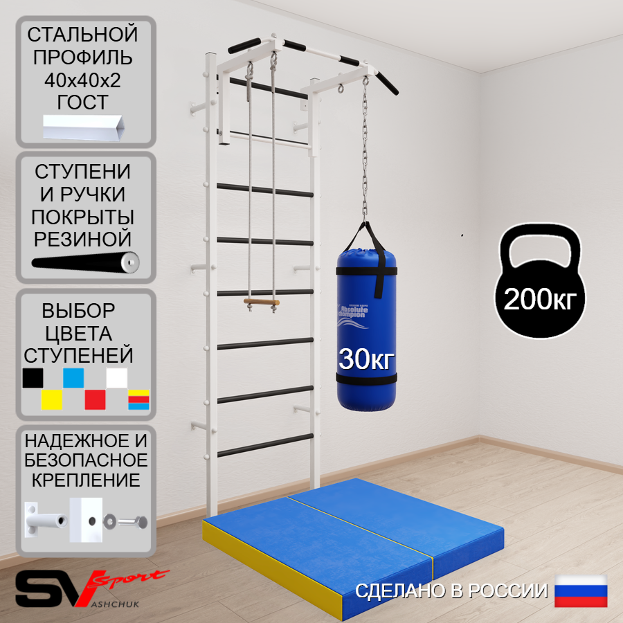 КОМПЛЕКТАЦИЯ: Шведская стенка Sv Sport (профиль вертикальных стоек 40 х 40 х 2 мм), Турник Sv Sport стандарт к ШС, Трапеция, Цепь удлинитель 90см, Мешок боксерский 30кг, Спортивный мат 100 х 100 х 10 см складной.