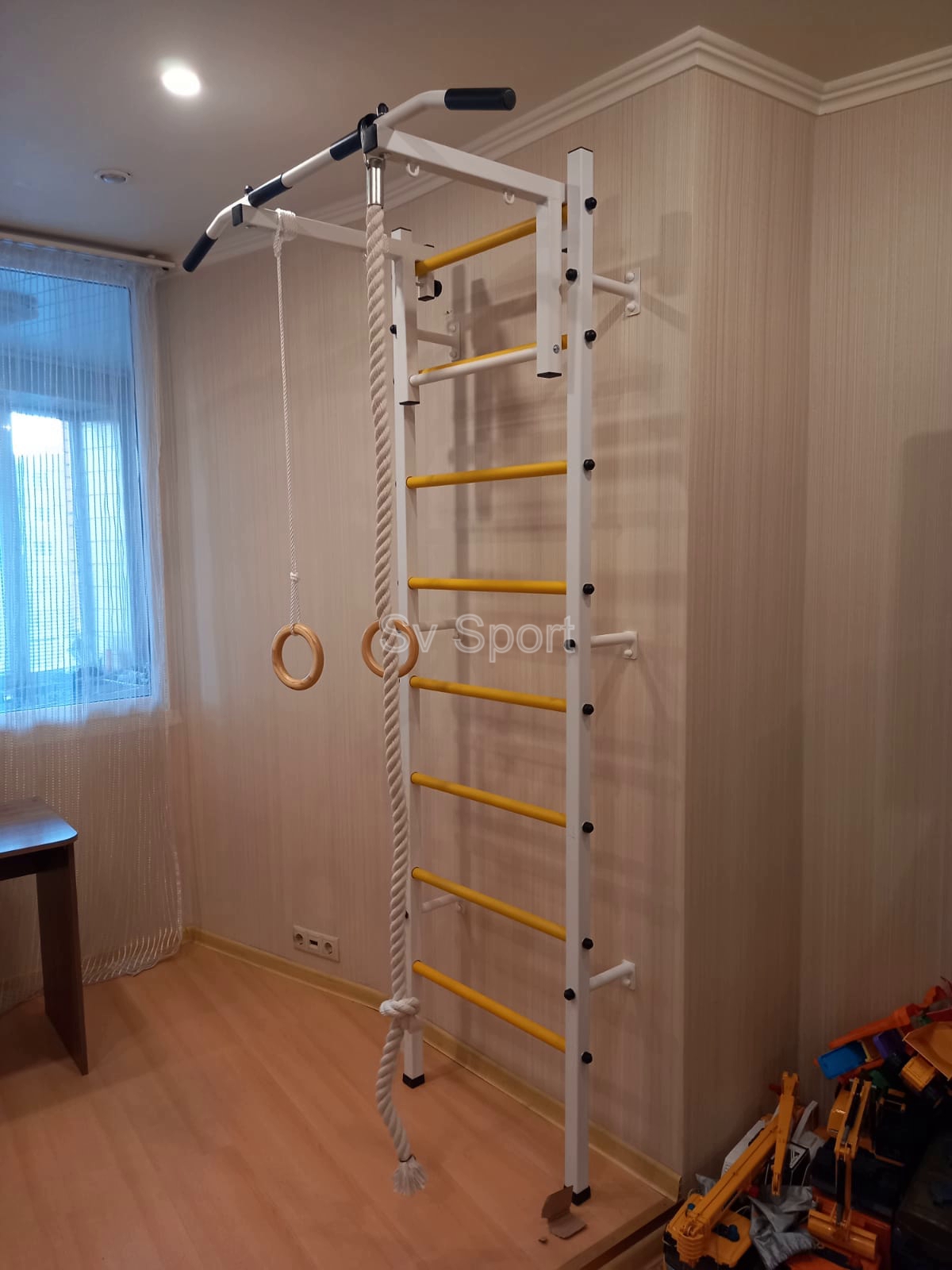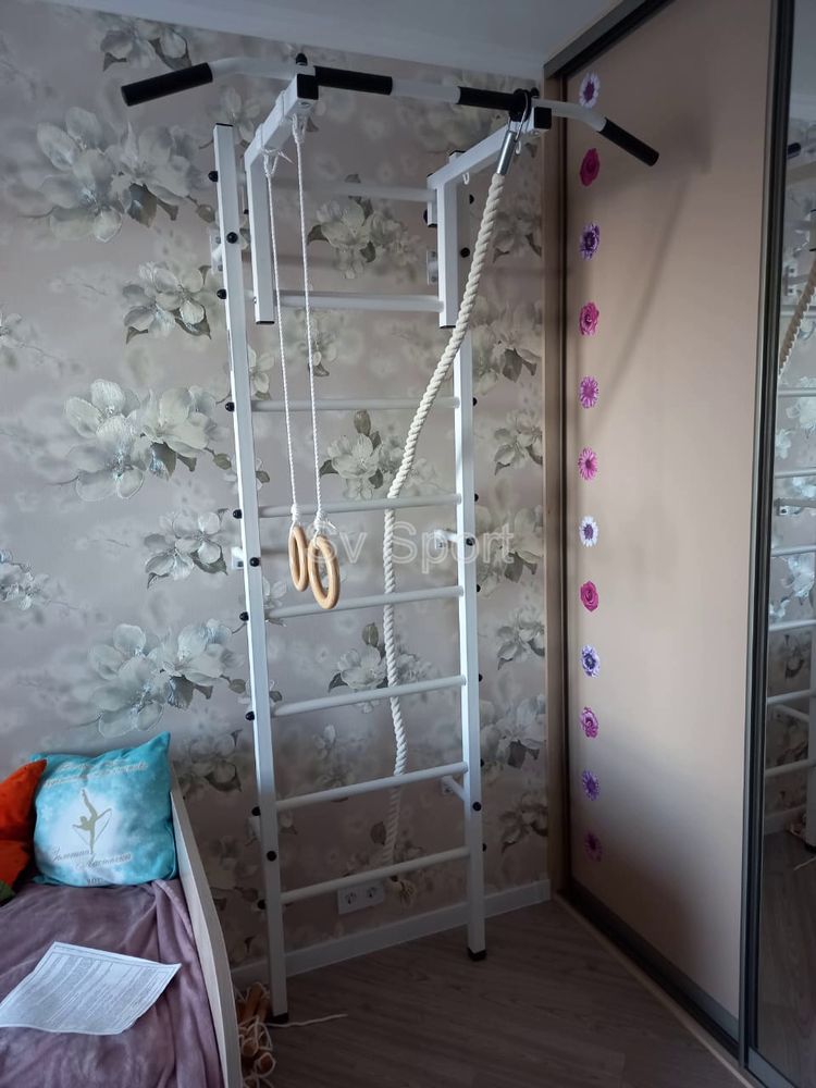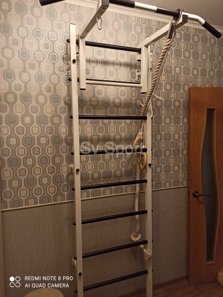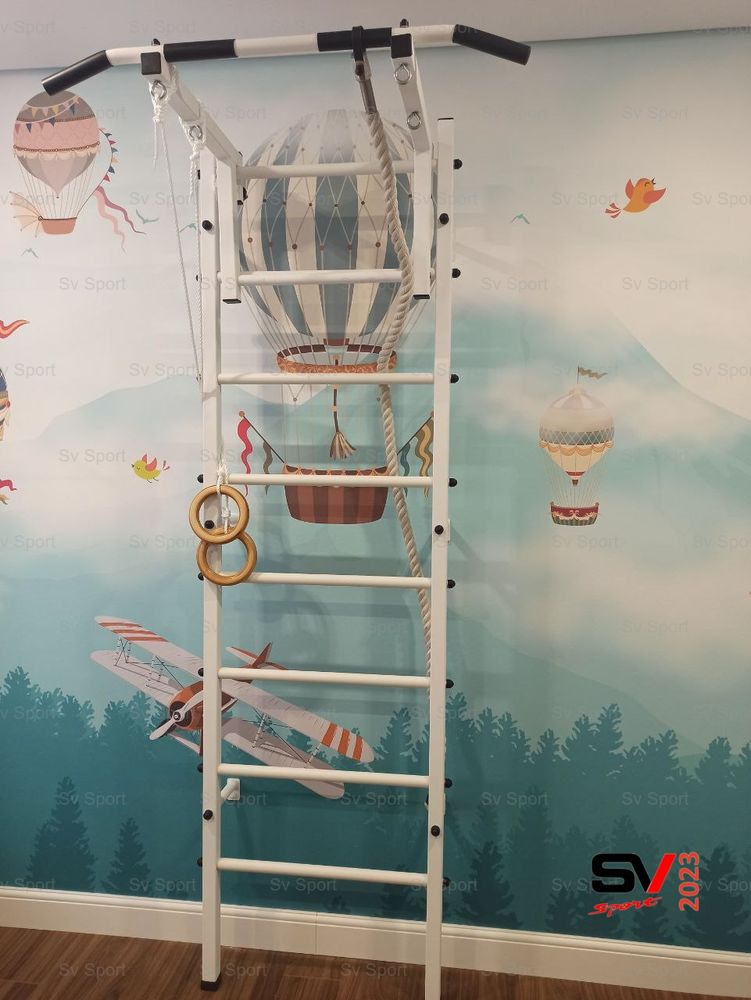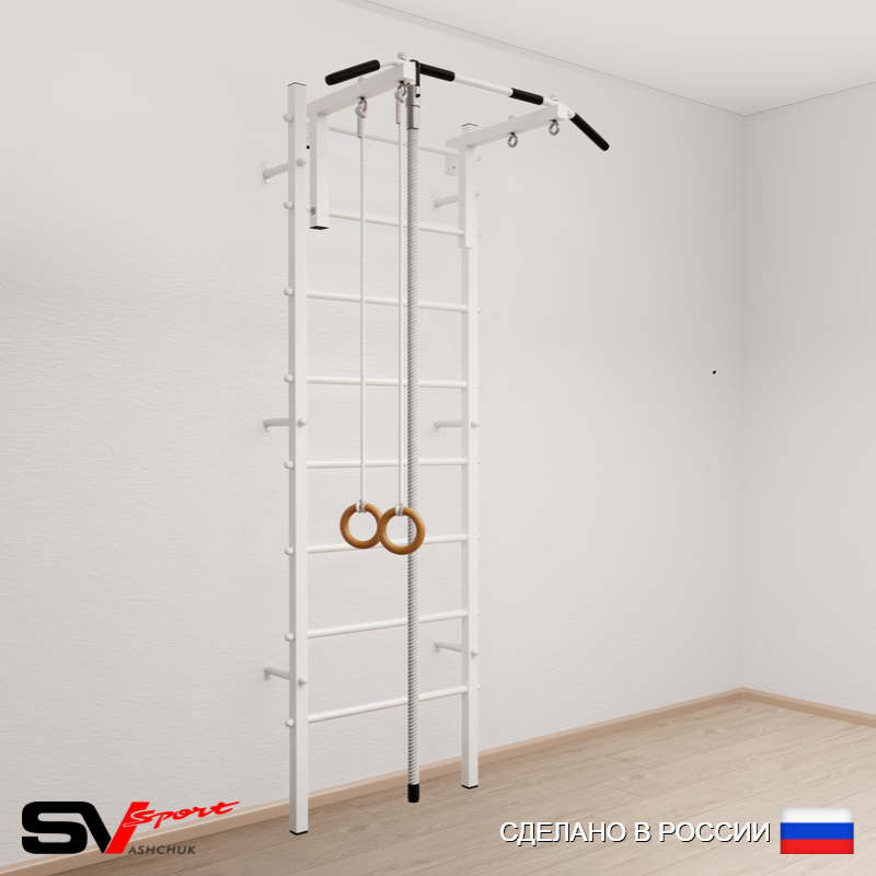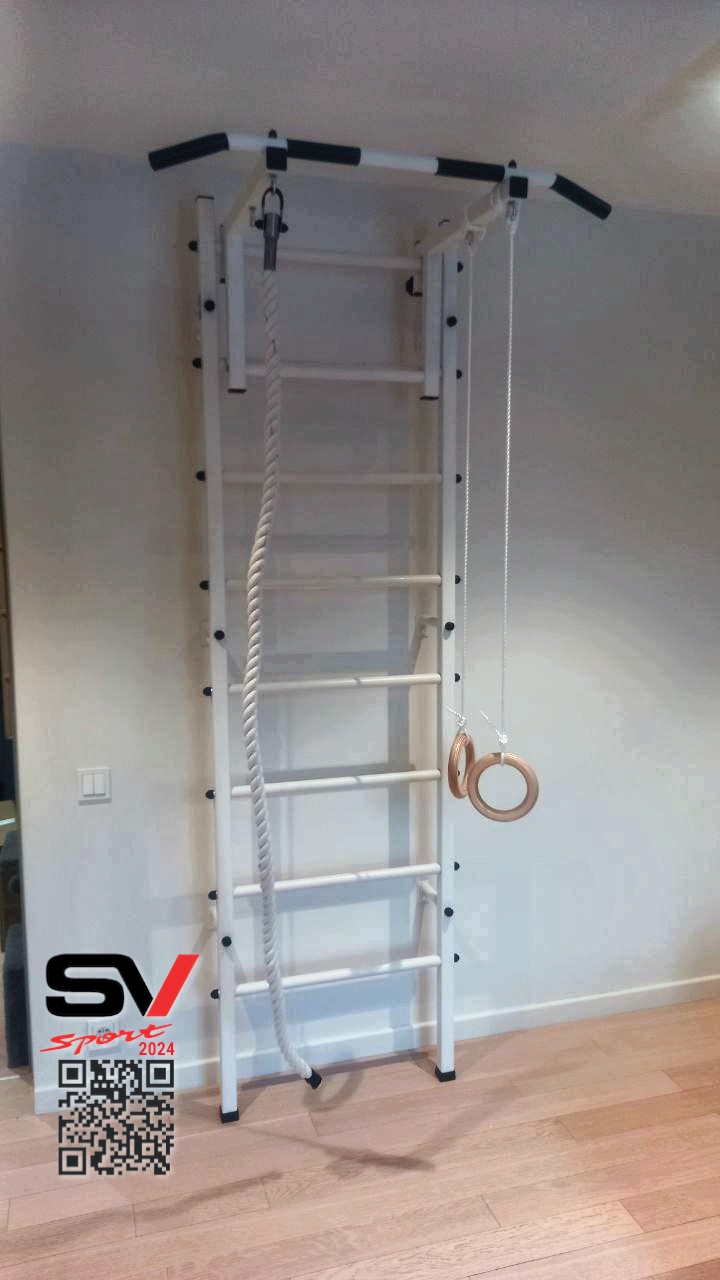 КОМПЛЕКТАЦИЯ: Шведская стенка Sv Sport (профиль вертикальных стоек 40 х 40 х 2 мм), Турник Sv Sport стандарт к ШС, Kанат, Kольца деревянные.