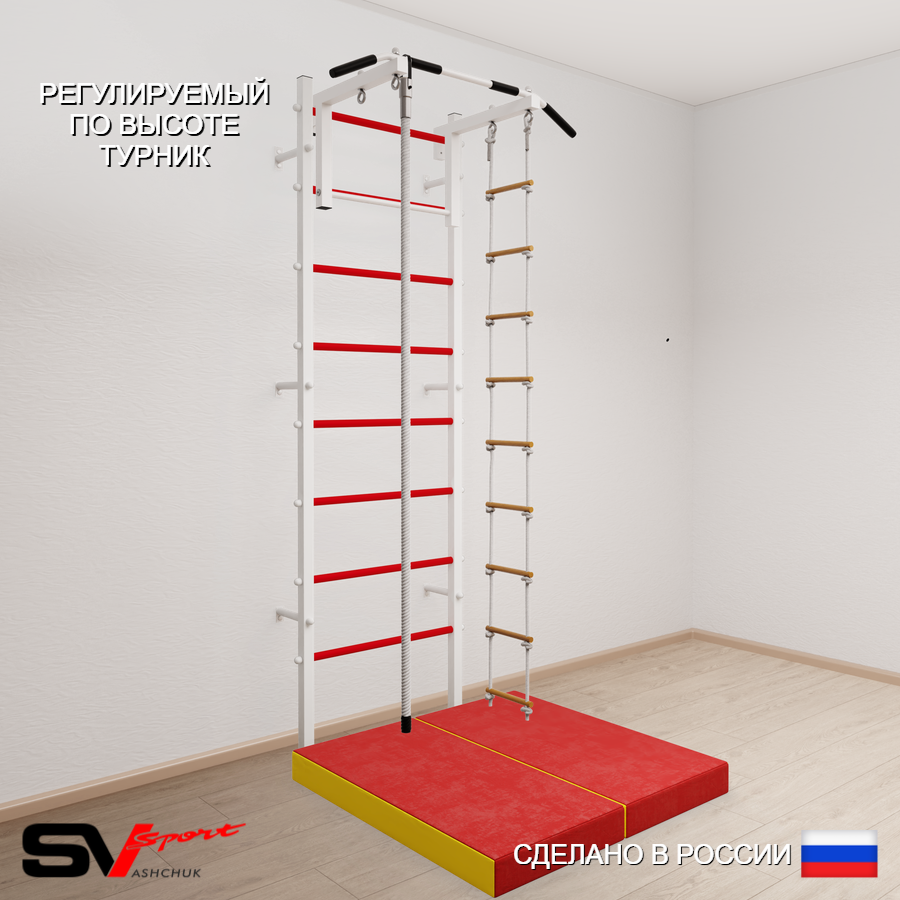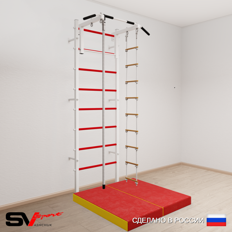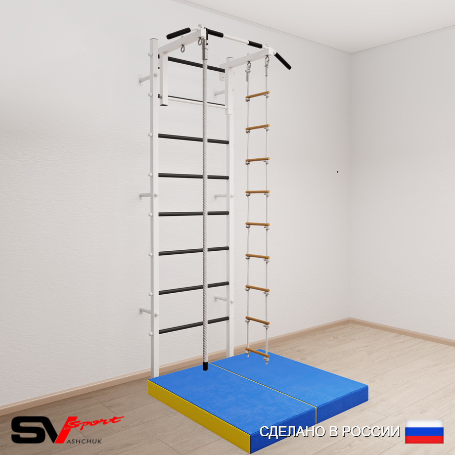 КОМПЛЕКТАЦИЯ: Шведская стенка Sv Sport (профиль вертикальных стоек 40 х 40 х 2 мм), Турник Sv Sport стандарт к ШС, Kанат, Лестница веревочная, Спортивный мат 100 х 100 х 10 см складной.