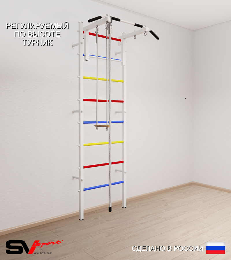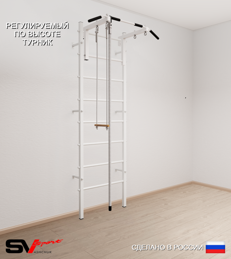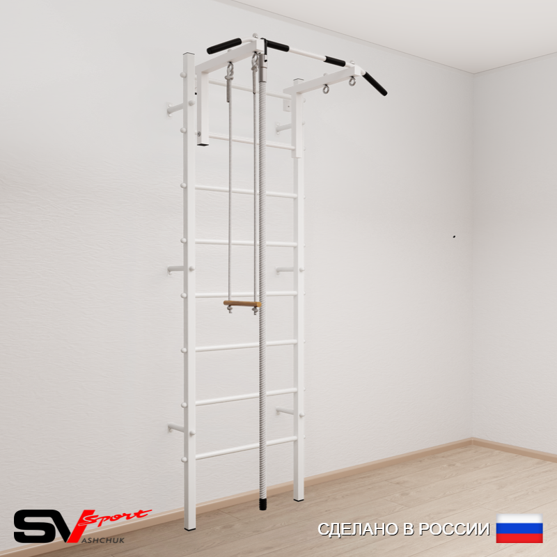 КОМПЛЕКТАЦИЯ: Шведская стенка Sv Sport (профиль вертикальных стоек 40 х 40 х 2 мм), Турник Sv Sport стандарт к ШС, Kанат, Трапеция.
