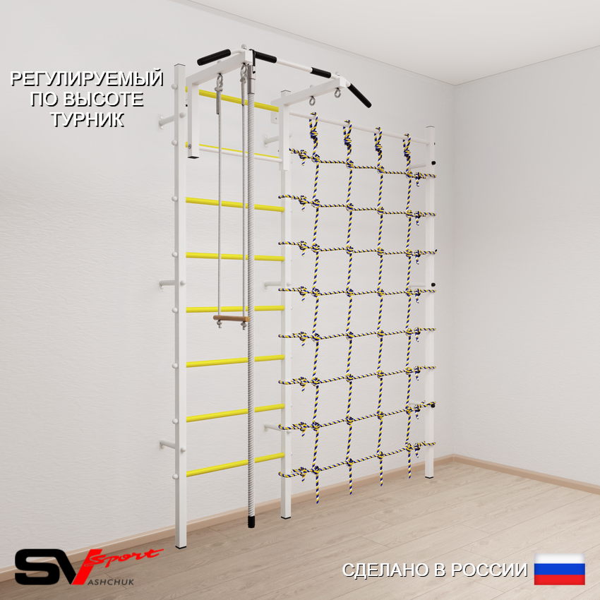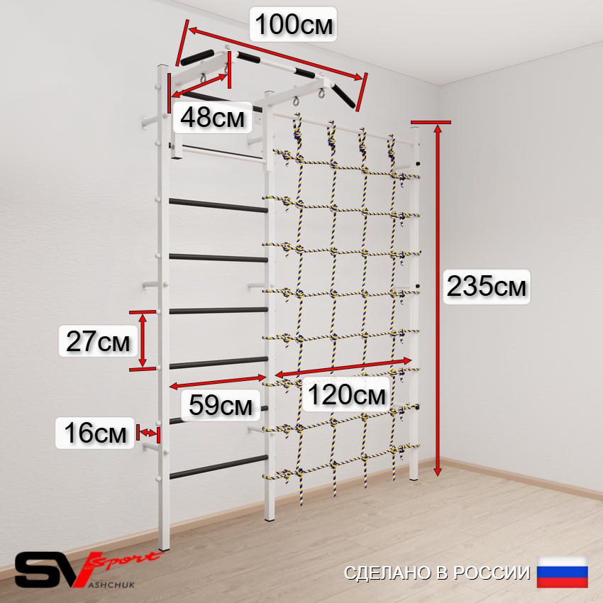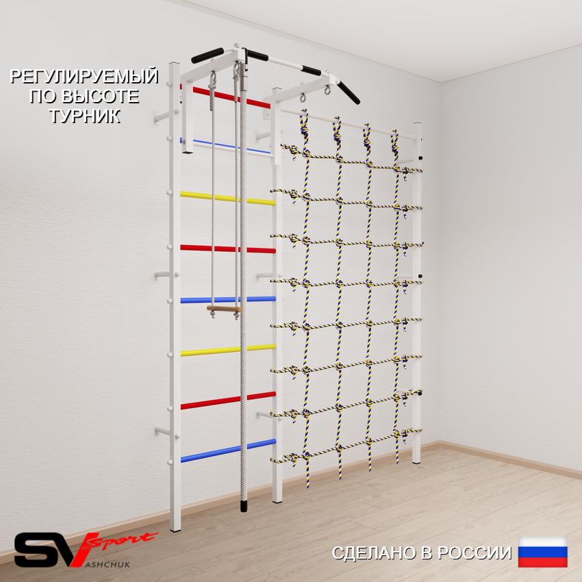 КОМПЛЕКТАЦИЯ: Шведская стенка Sv Sport (профиль вертикальных стоек 40 х 40 х 2 мм), Турник Sv Sport стандарт к ШС, Kанат, Трапеция, Канатный лаз.