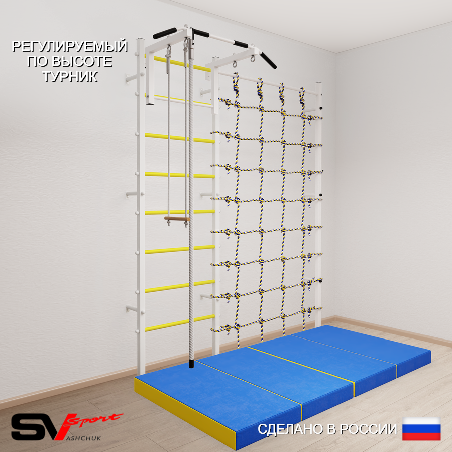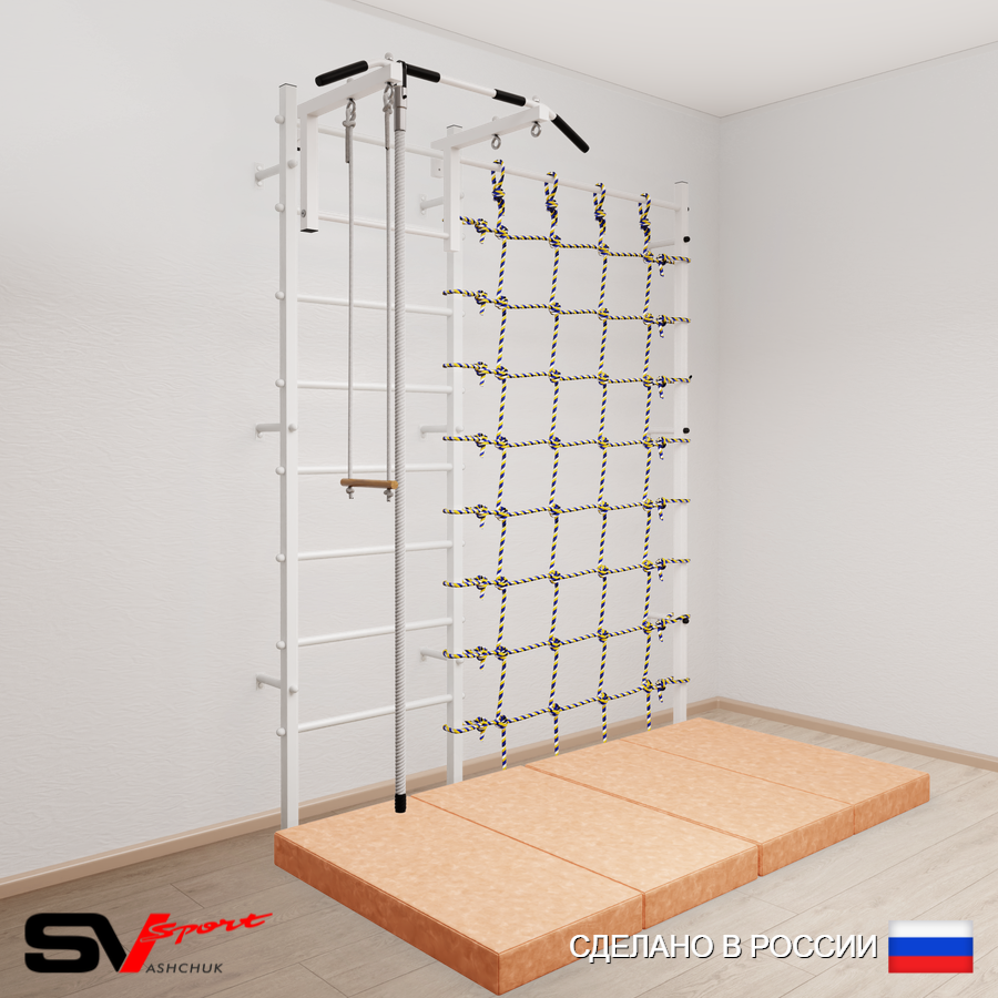 КОМПЛЕКТАЦИЯ: Шведская стенка Sv Sport (профиль вертикальных стоек 40 х 40 х 2 мм), Турник Sv Sport стандарт к ШС, Kанат, Трапеция, Спортивный мат 100 х 200 х 10 см складной, Канатный лаз.