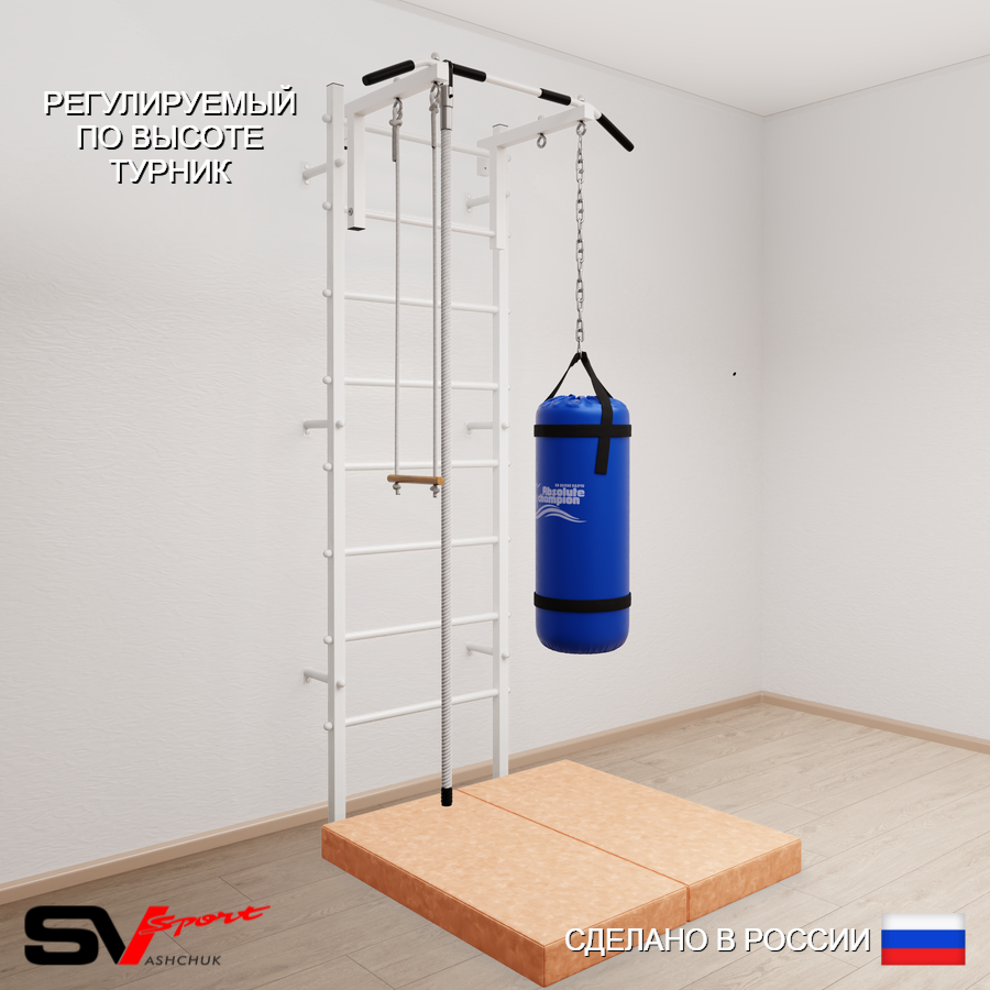 КОМПЛЕКТАЦИЯ: Шведская стенка Sv Sport (профиль вертикальных стоек 40 х 40 х 2 мм), Турник Sv Sport стандарт к ШС, Kанат, Трапеция, Цепь удлинитель 90см, Мешок боксерский 22кг, Спортивный мат 100 х 100 х 10 см складной.