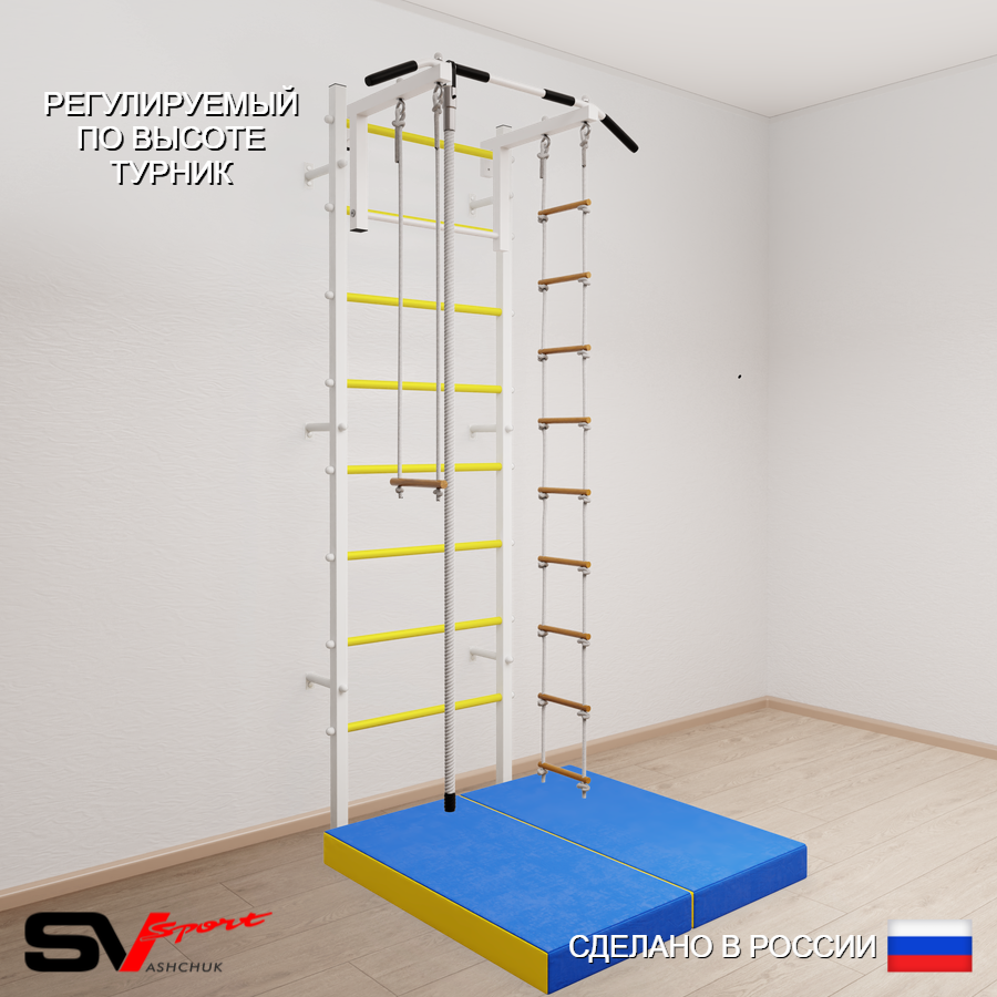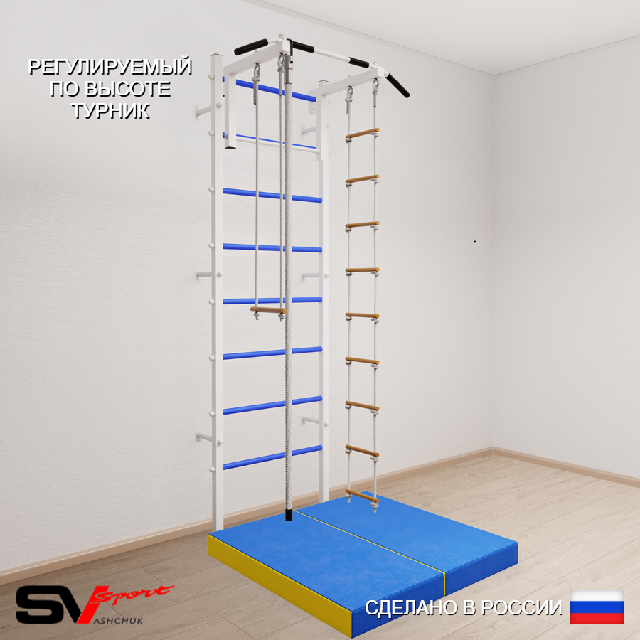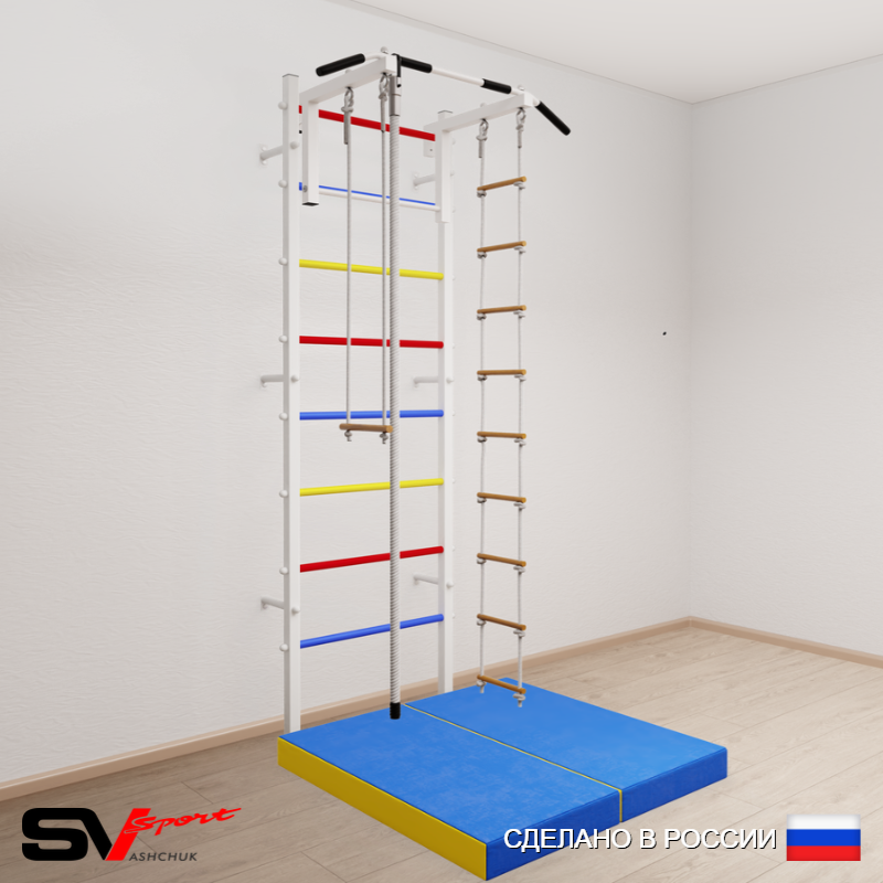 КОМПЛЕКТАЦИЯ: Шведская стенка Sv Sport (профиль вертикальных стоек 40 х 40 х 2 мм), Турник Sv Sport стандарт к ШС, Kанат, Трапеция, Лестница веревочная, Спортивный мат 100 х 100 х 10 см складной.