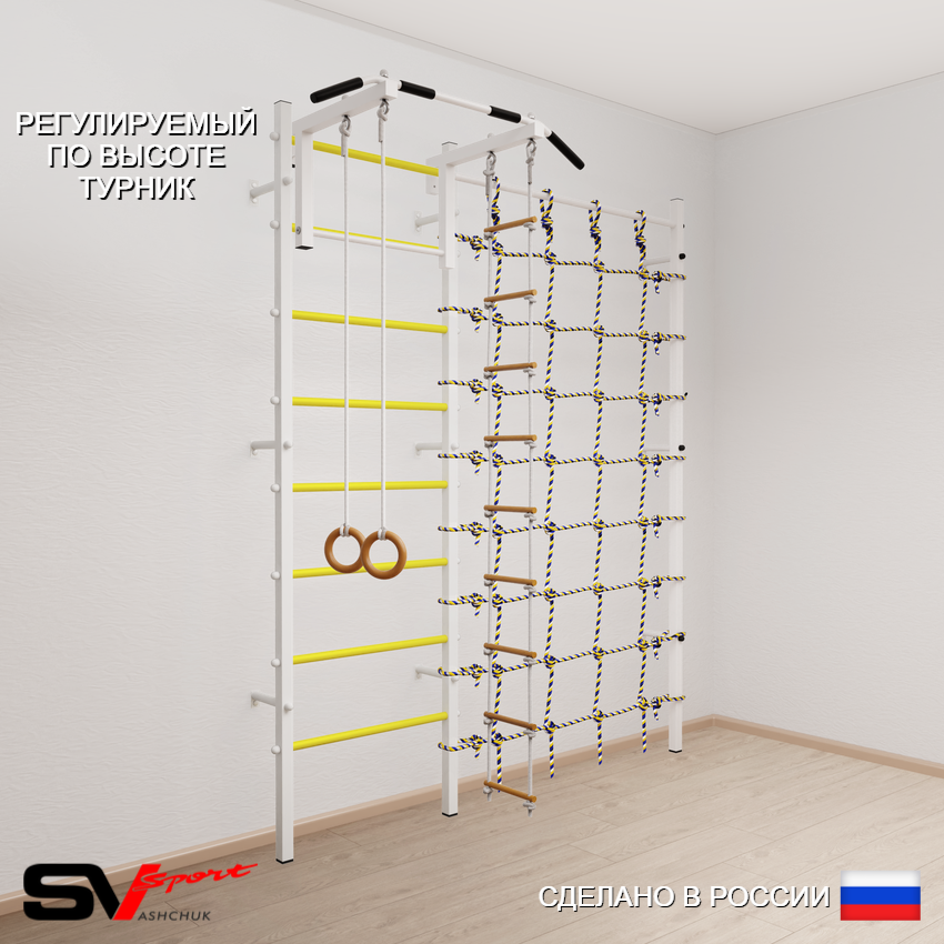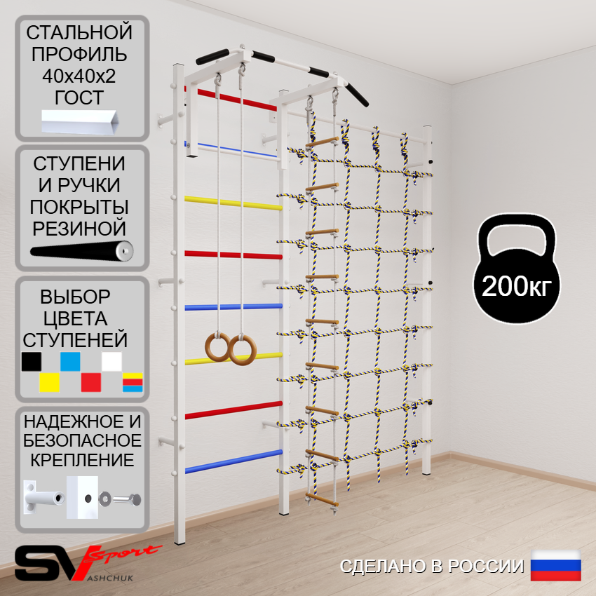 КОМПЛЕКТАЦИЯ: Шведская стенка Sv Sport (профиль вертикальных стоек 40 х 40 х 2 мм), Турник Sv Sport стандарт к ШС, Kольца деревянные, Лестница веревочная, Канатный лаз.